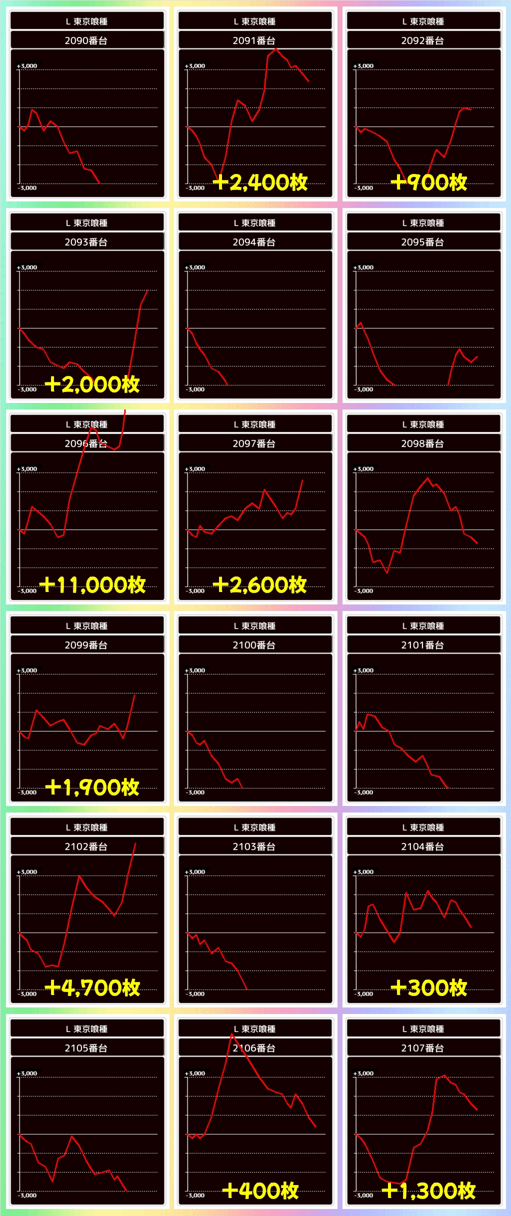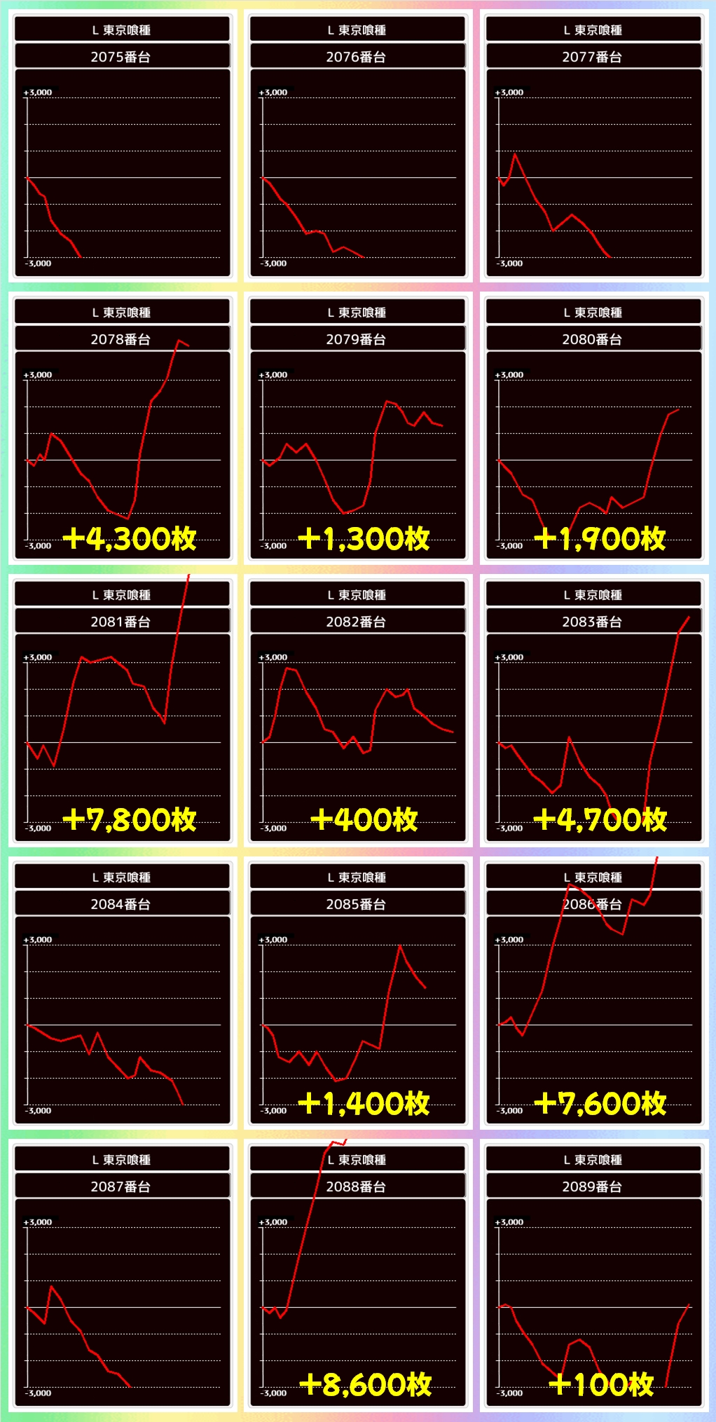 また、東京喰種からはパネル仕掛けが用意されていた模様で、2095~2097番台の有馬パネルが全台当たりと思しき挙動を見せていました。