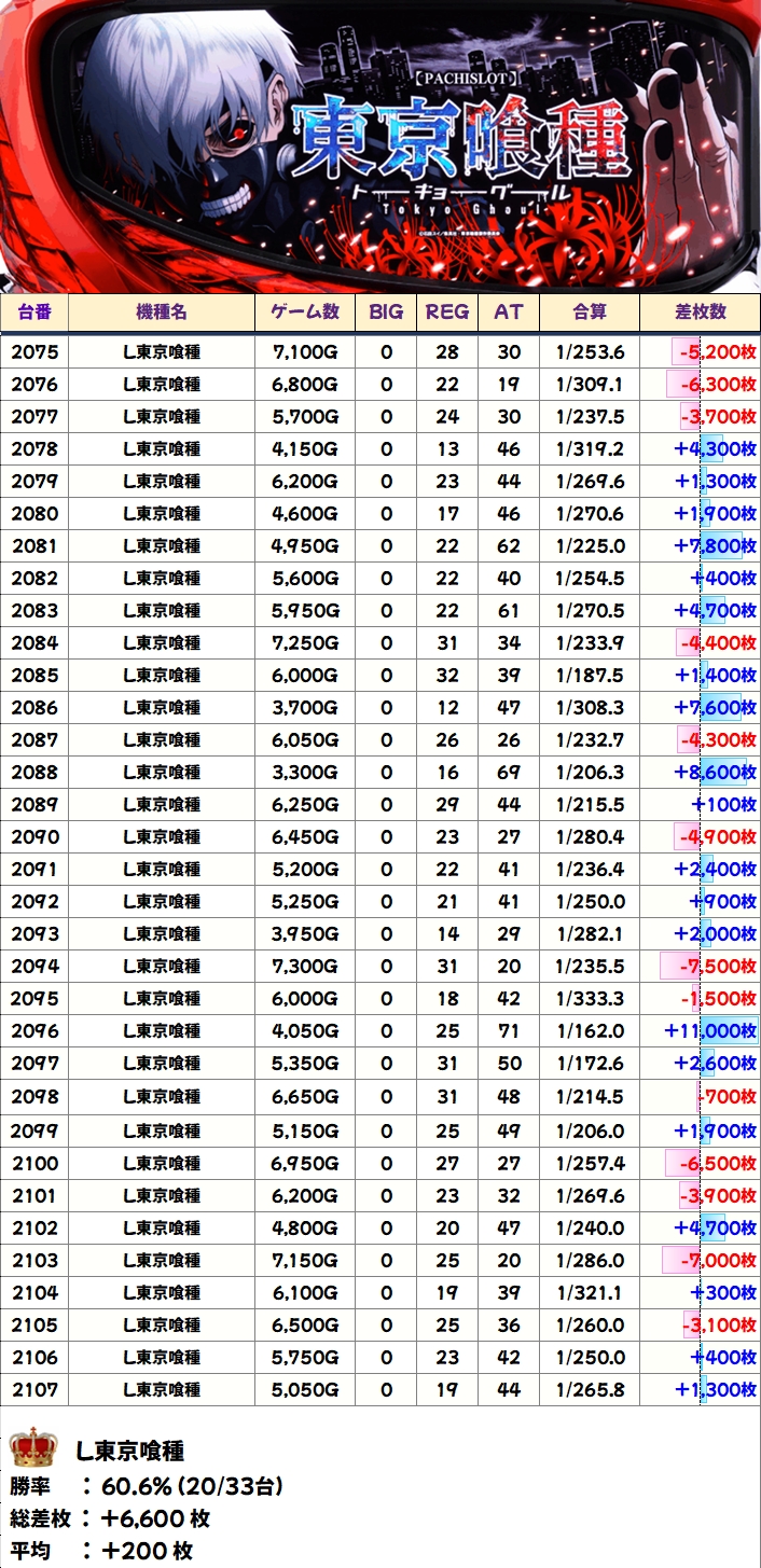 【1/2系濃厚】L東京喰種(20/33台+)→平均+200枚