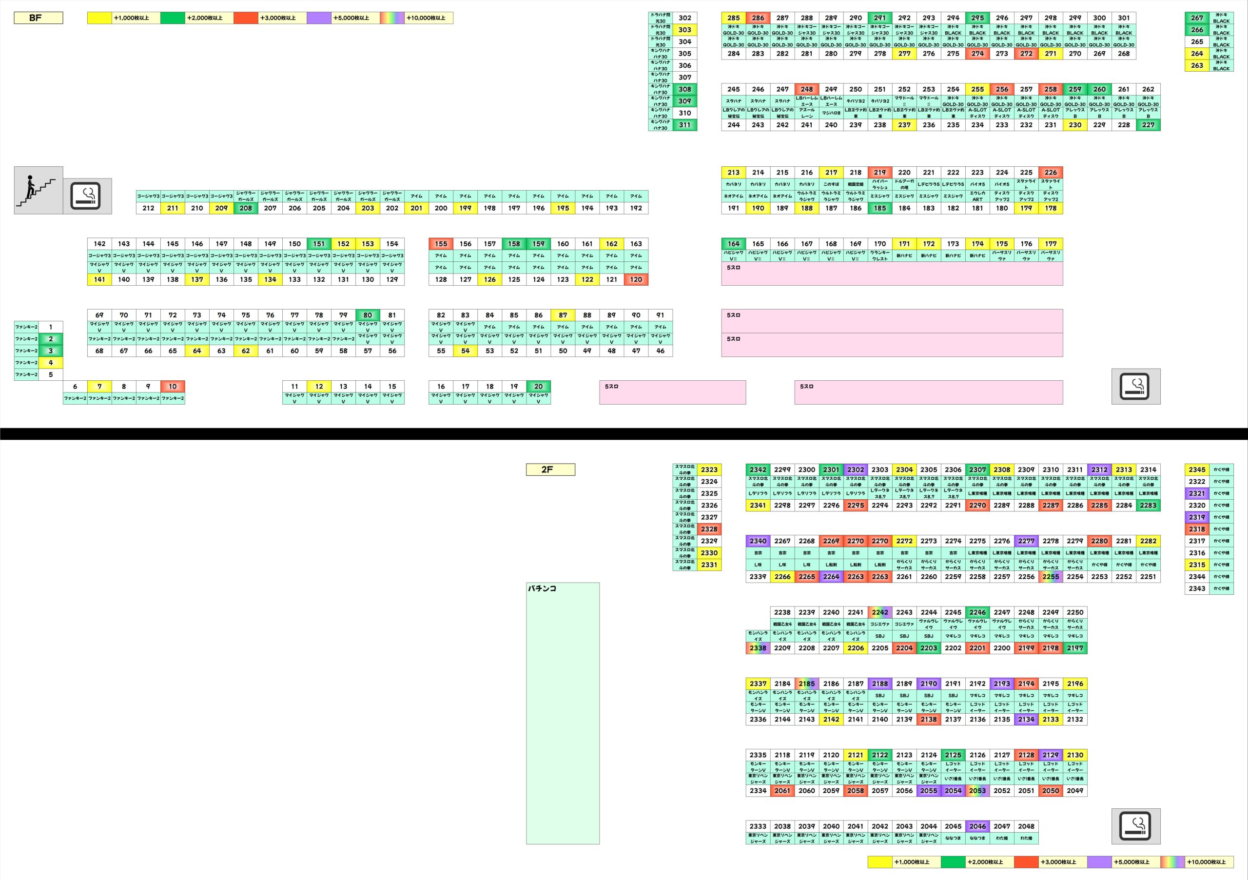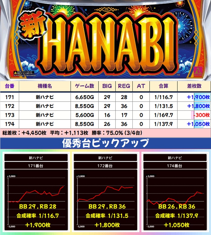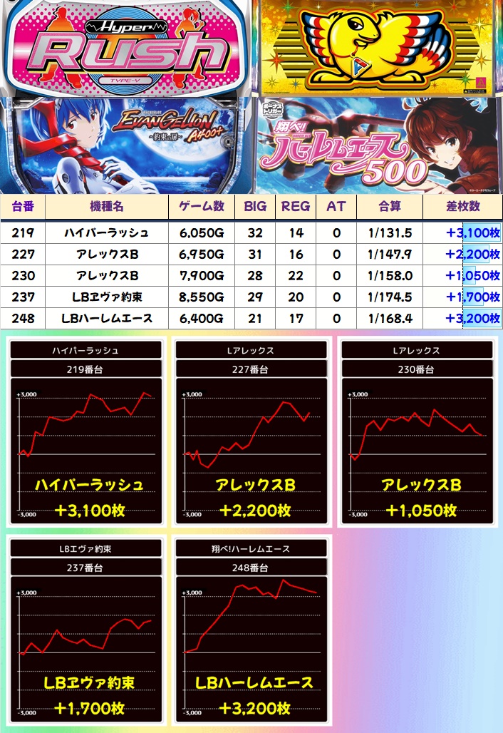 ノーマルにも高配分機種が複数あり、新ハナビ・バーサスリヴァ・ディスクアップ2が1/2系濃厚に。ハイパーラッシュやLBハーレムエースにも+3,000枚オーバー台があったりと、抜かりない仕掛けが用意されていました。