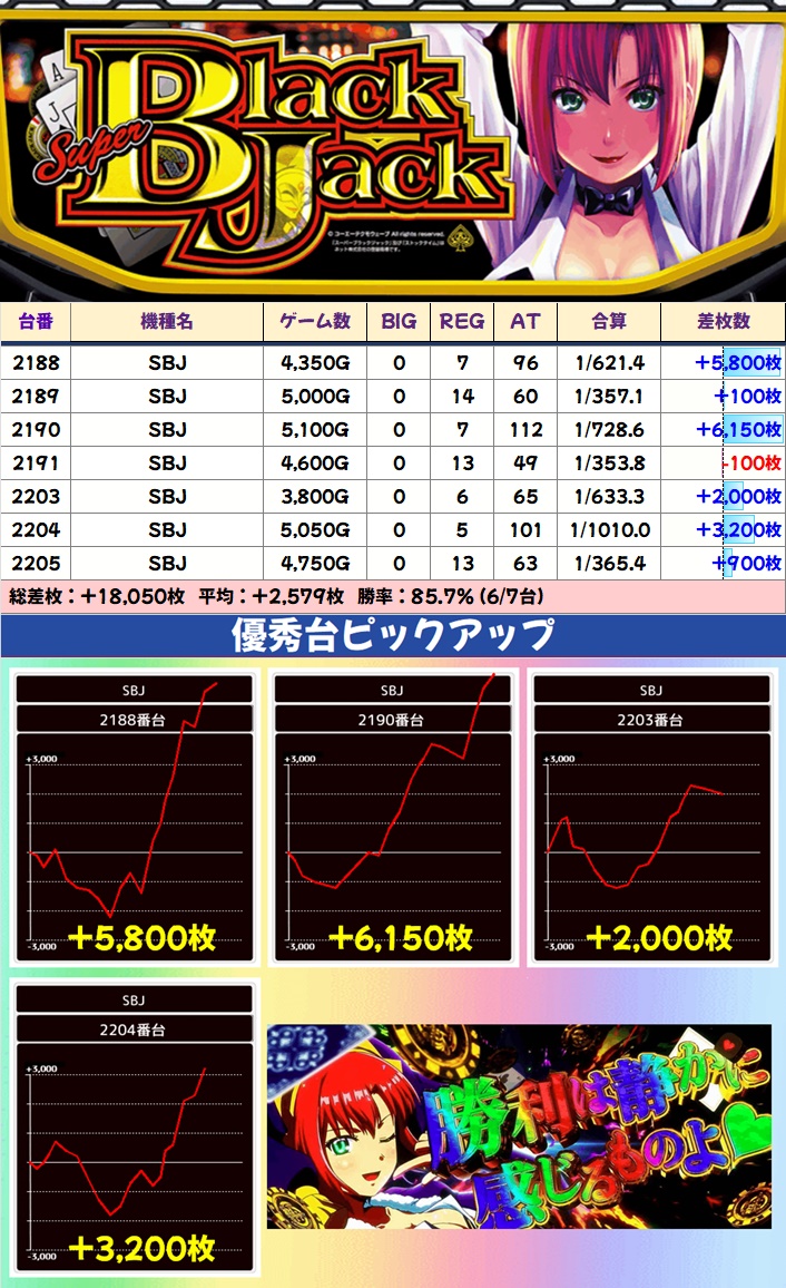 9/8~9/14の週間オススメ機種になっていたSBJが7台中6台プラスと優秀。オススメ期間は連日期待できる状況だったと思われますが、今回も全体的に高配分になっていたようで、平均+2,579枚とガッツリ出ていました。週間オススメ機種もかなり狙い目になりそうです!
