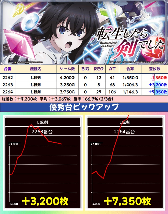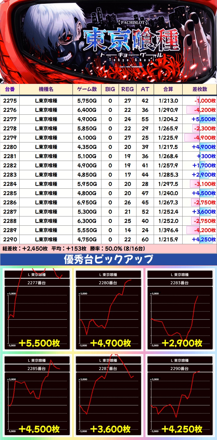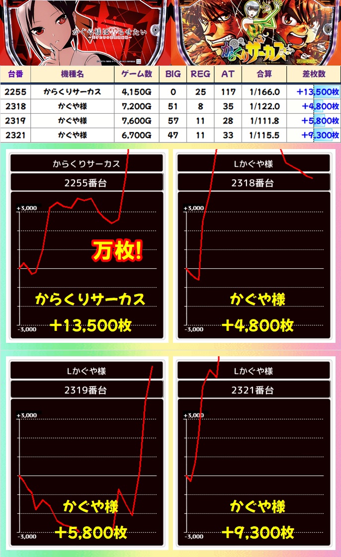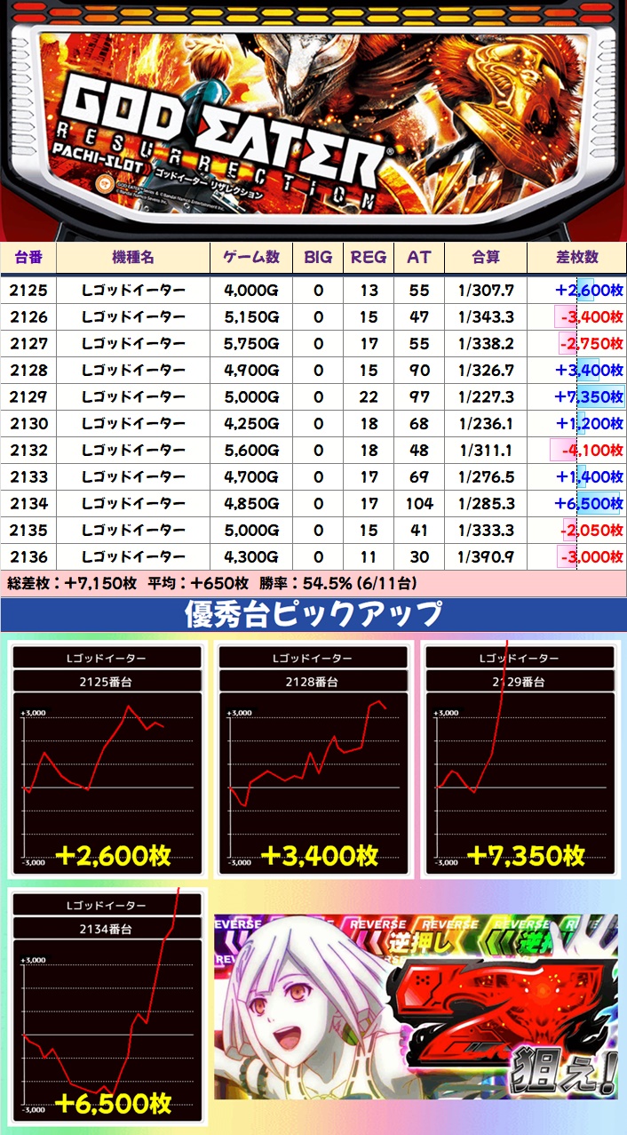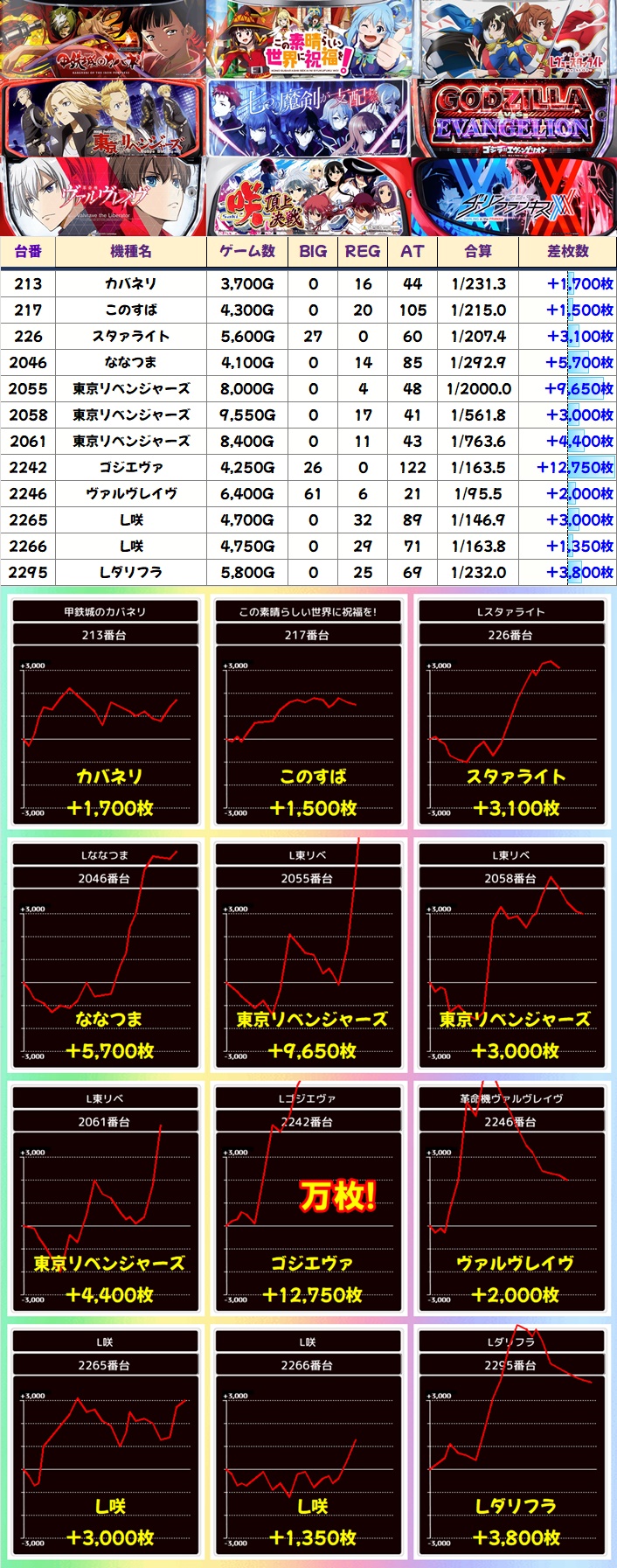 単品の優秀台も散見され、ゴジエヴァから万枚突破台が出現したほか新台の東京リベンジャーズにも万枚目前の台があったりと、随所で盛り上がっていました。