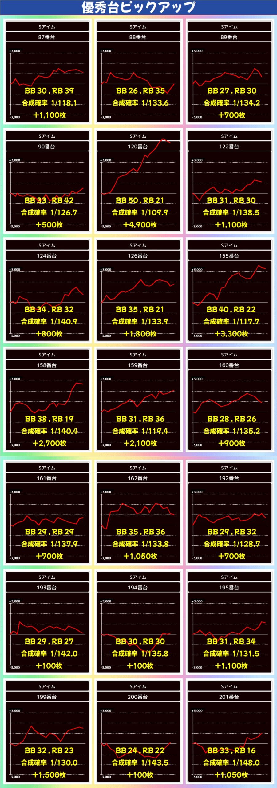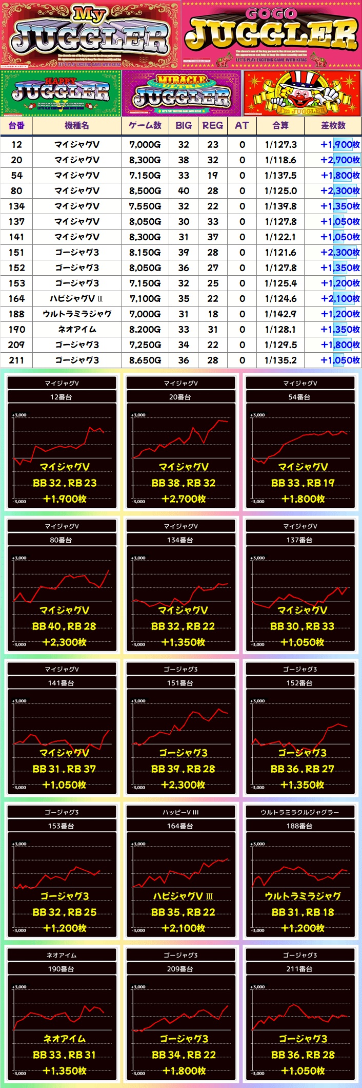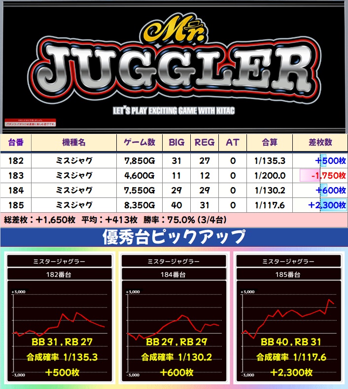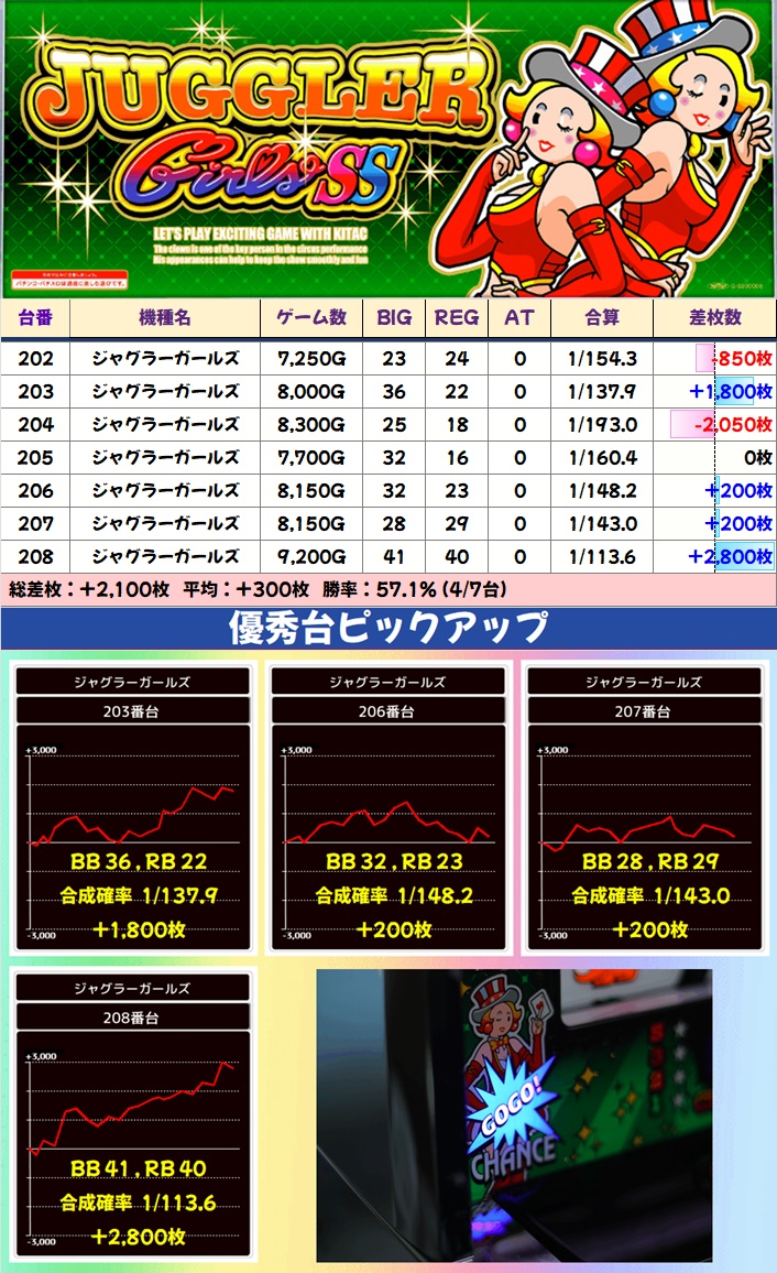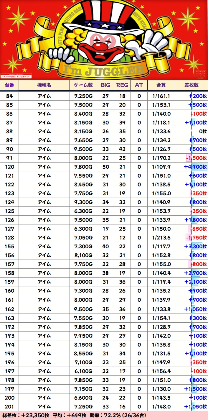 ジャグラーシリーズはアイム・ファンキー2・ジャグラーガールズ・ミスジャグが1/2系以上と思われる内容で、特に多くの優秀台が出現。その他シリーズも台数の多いマイジャグ・ゴージャグを筆頭に単品の優秀台が散見されました。
