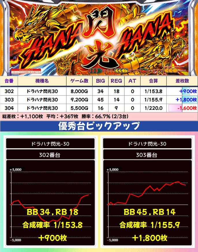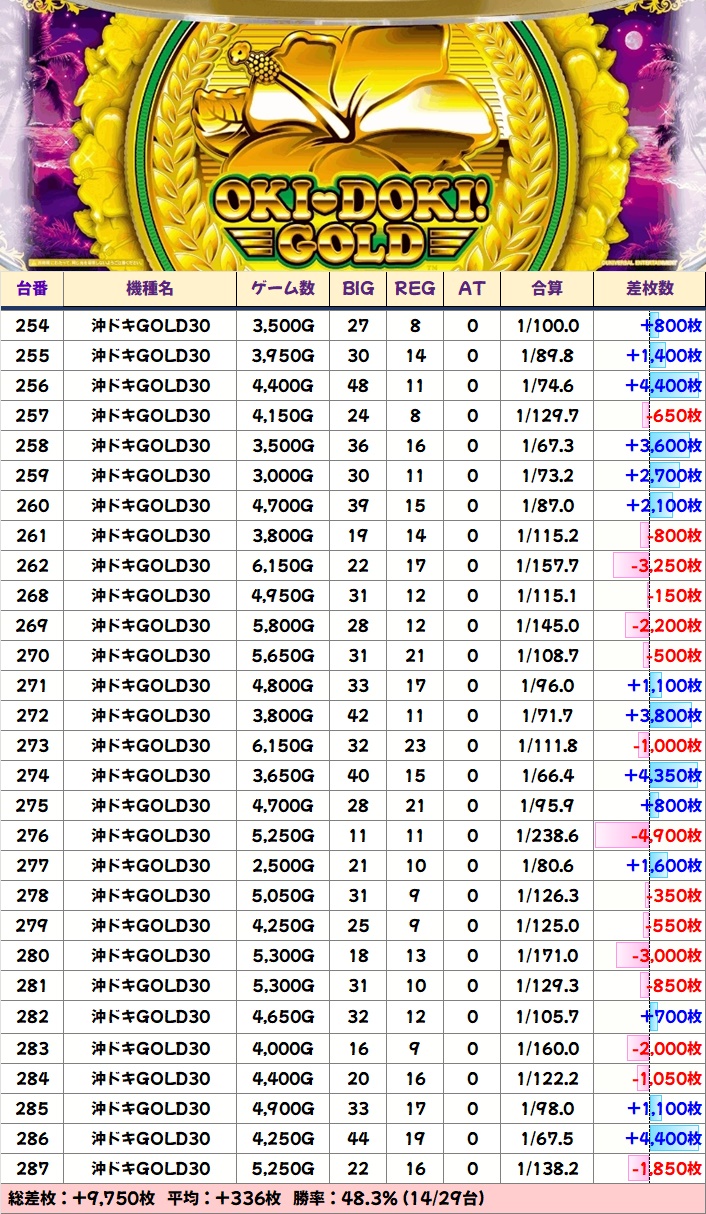 今回の沖スロコーナーはハナハナシリーズのドラハナ閃光・キンハナが1/2系濃厚で、いずれも半数以上がプラス差枚でフィニッシュ。最も台数の多い沖ドキGOLDも高勝率で、全体的に高配分と思われる結果でした。