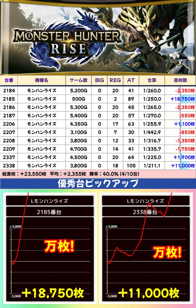 主力機ではマギレコが全台系濃厚で平均+1,700枚オーバーの好成績。モンハン・Lゴッドイーターは1/2系濃厚となっており、モンハンは2台が万枚突破かつ1台がコンプリート達成と絶好調でした。
