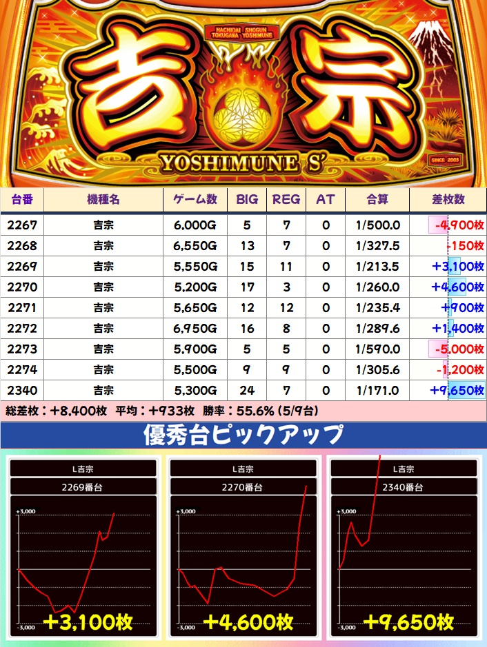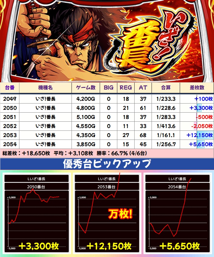 少台数機種ではL転剣、その他人気機種ではいざ!番長・吉宗が1/2系濃厚。いずれも大量出玉の優秀台が続出し、いざ!番長には万枚突破台も確認できました。