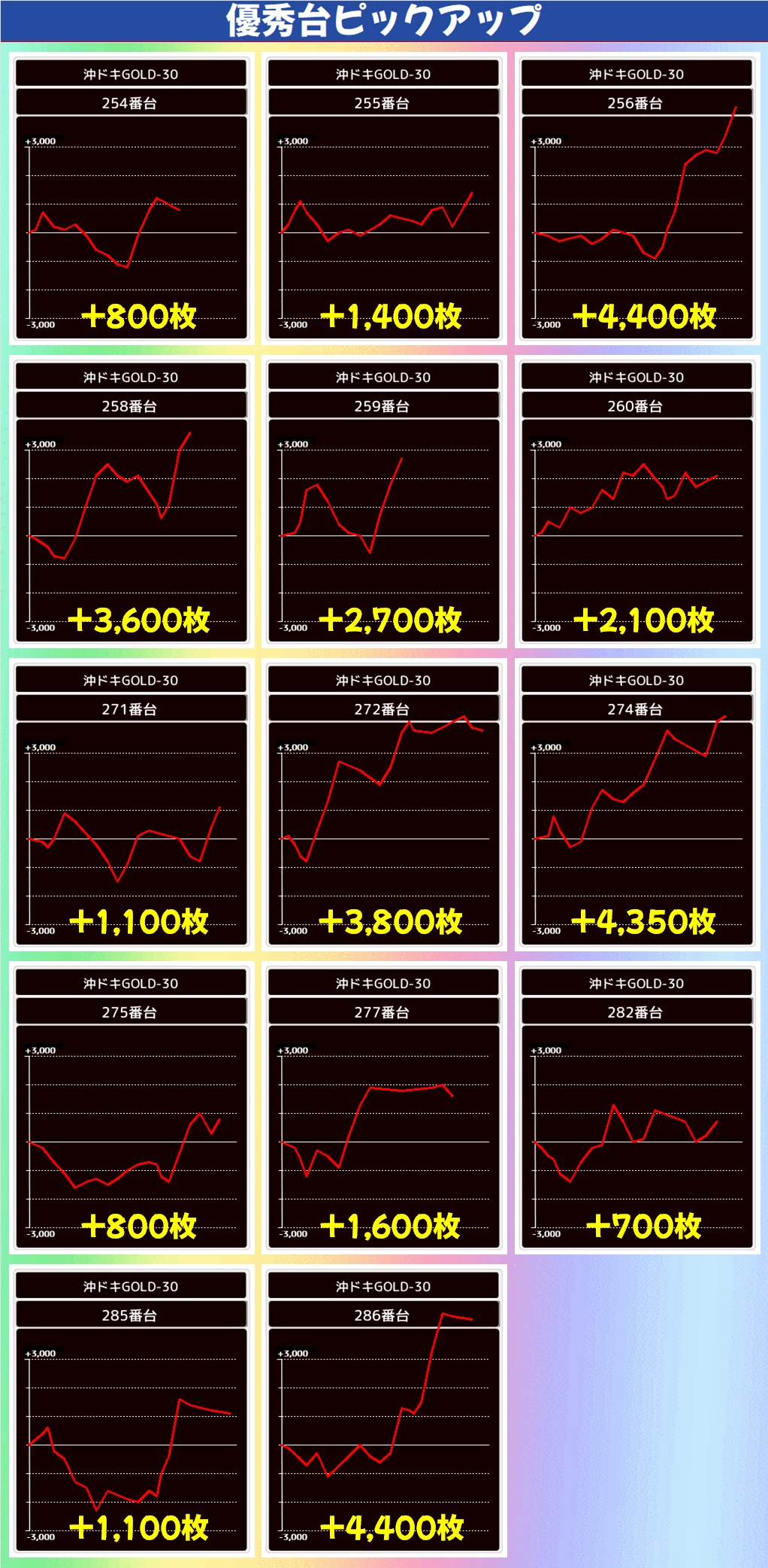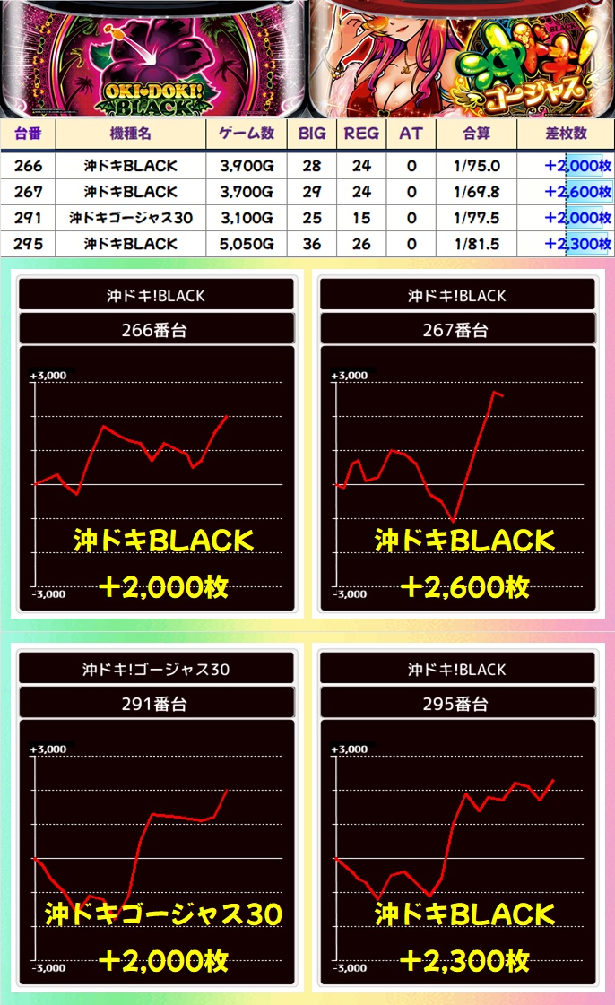 単品では沖ドキBLACKや沖ドキゴージャスに+2,000枚以上の台を確認。3のつく日の沖スロコーナーはお宝満載の状況になっているので、今後もぜひ狙ってみてください!