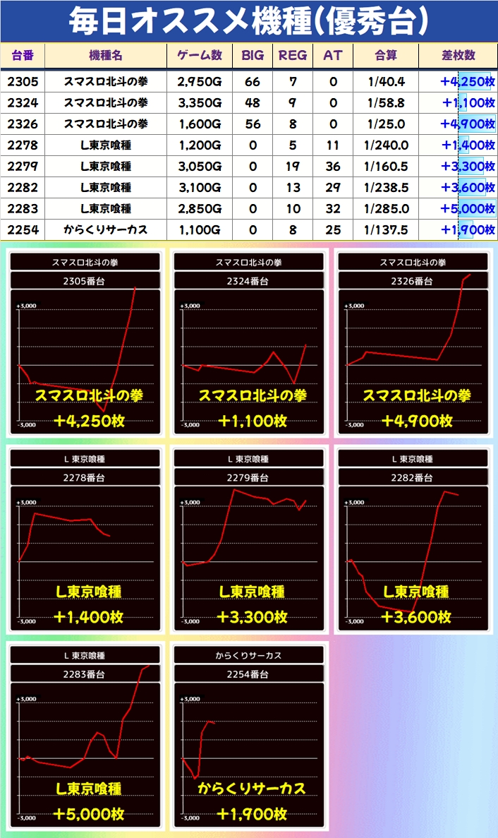 毎日オススメ機種にも各機種優秀台あり!今回は北斗と東京喰種が出玉や優秀台が頭一つ抜けて多かった!