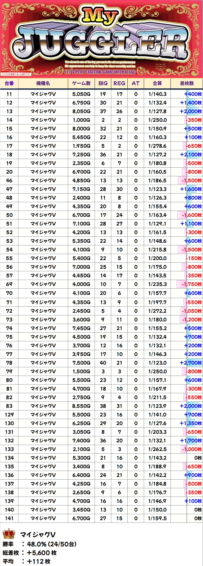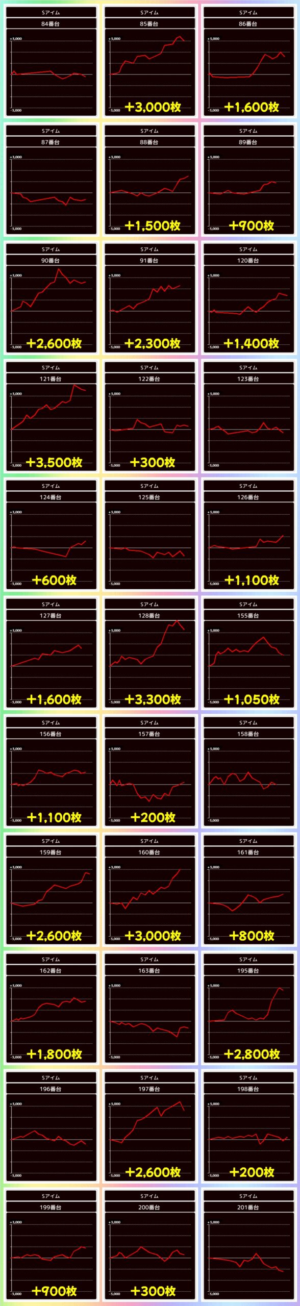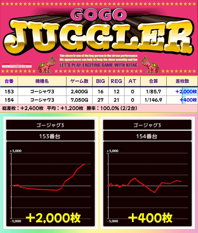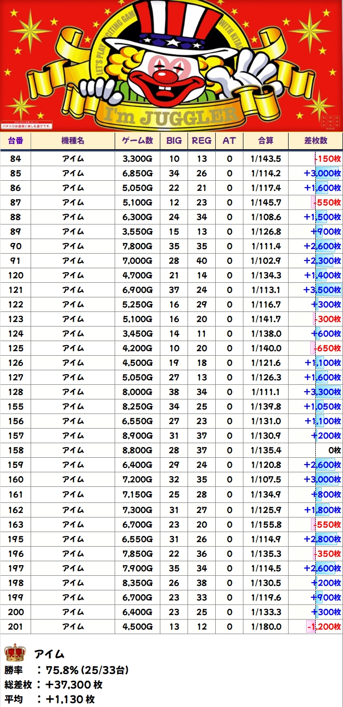 1/2系以外のジャグにも単品優秀台を確認!ネオアイムやゴージャグにはプラス台が連続している箇所もあったので、2台並びも複数あったのでしょう。