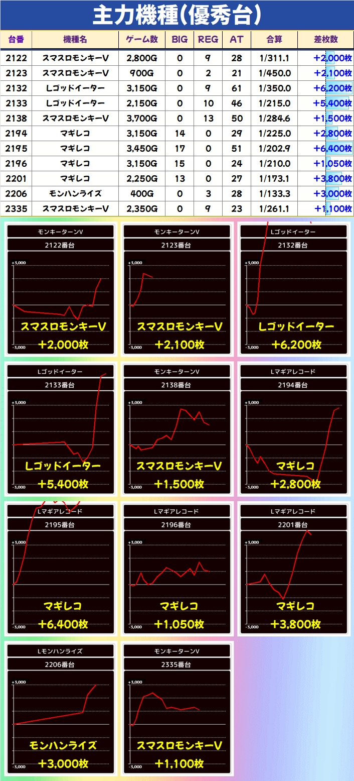 毎日オススメ機種と同様に主力機種にも優秀台多数!主力機種はマギレコが優秀でした!