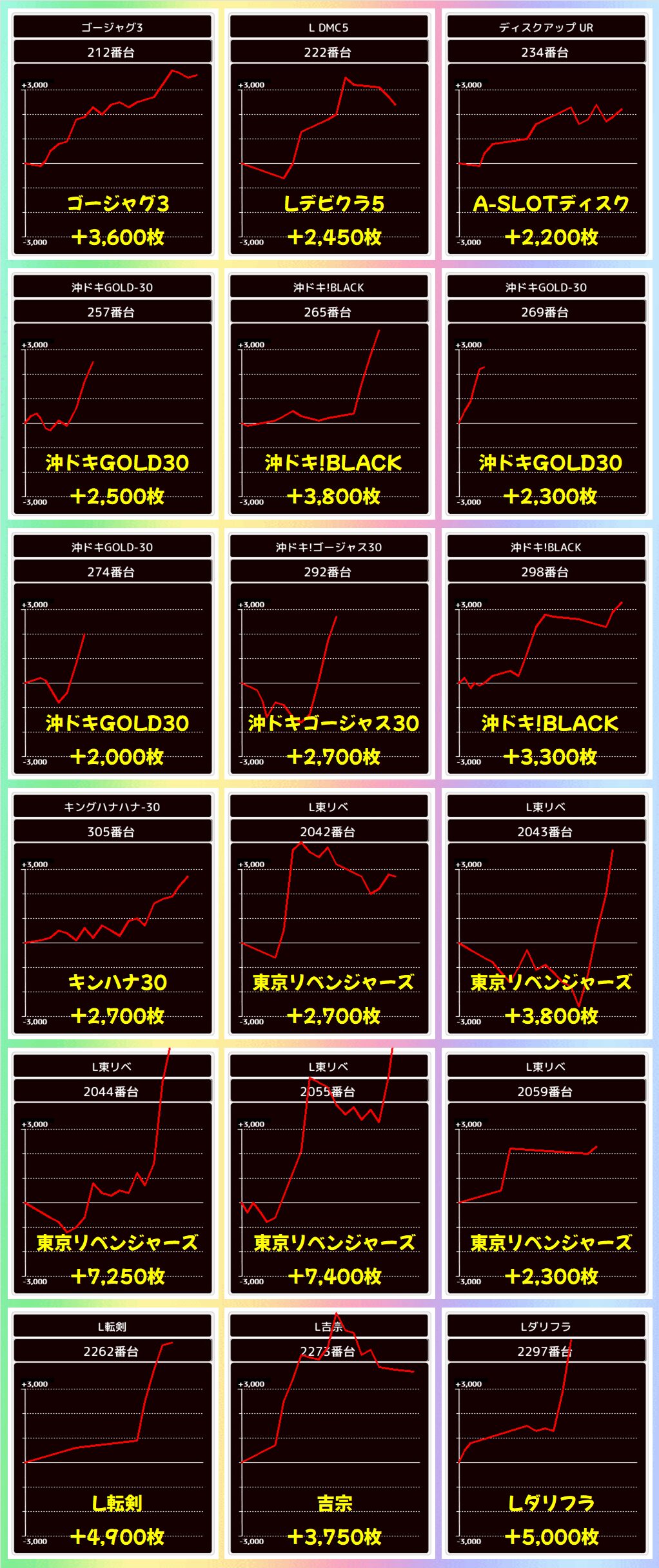 単品優秀台も数多くあり新台の東リべや沖スロ系が目立っていました。18日はスマスロに力が入っているので、迷ったらまずスマスロにいくべきですよ。