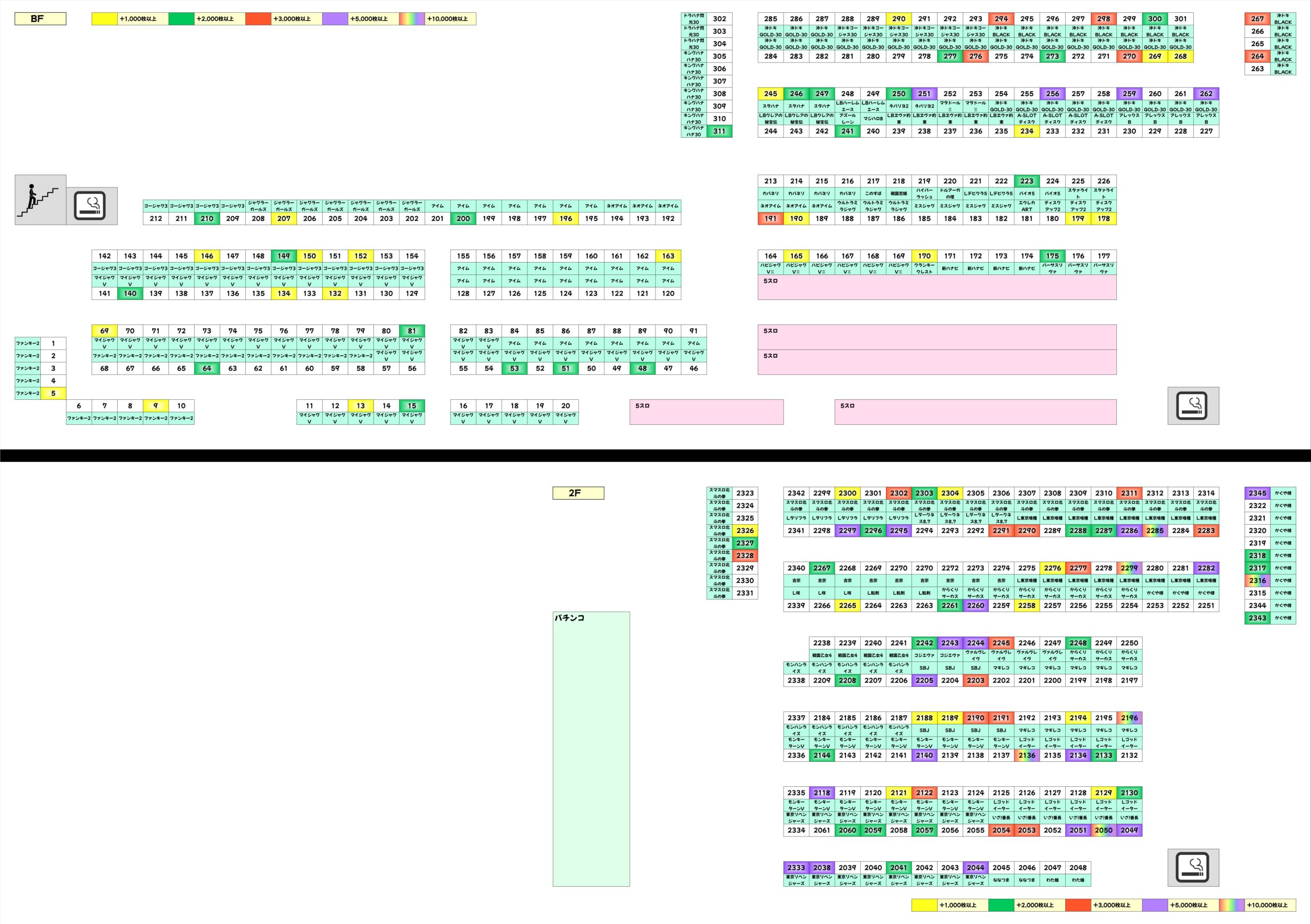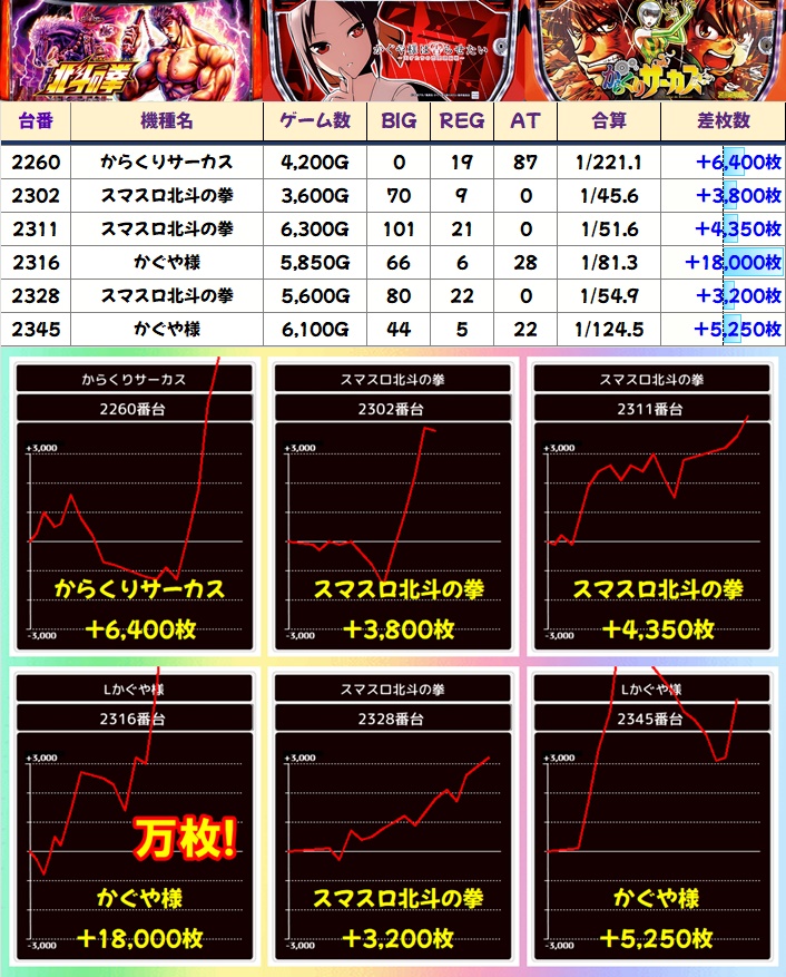 今回も幅広い仕掛けで至るところから大量出玉の優秀台が出現し、+3,000枚オーバー台が全部で48台出現。万枚突破台は6台あり、いざ!番長・かぐや様にコンプ台があったりと、随所で盛り上がっていました。
