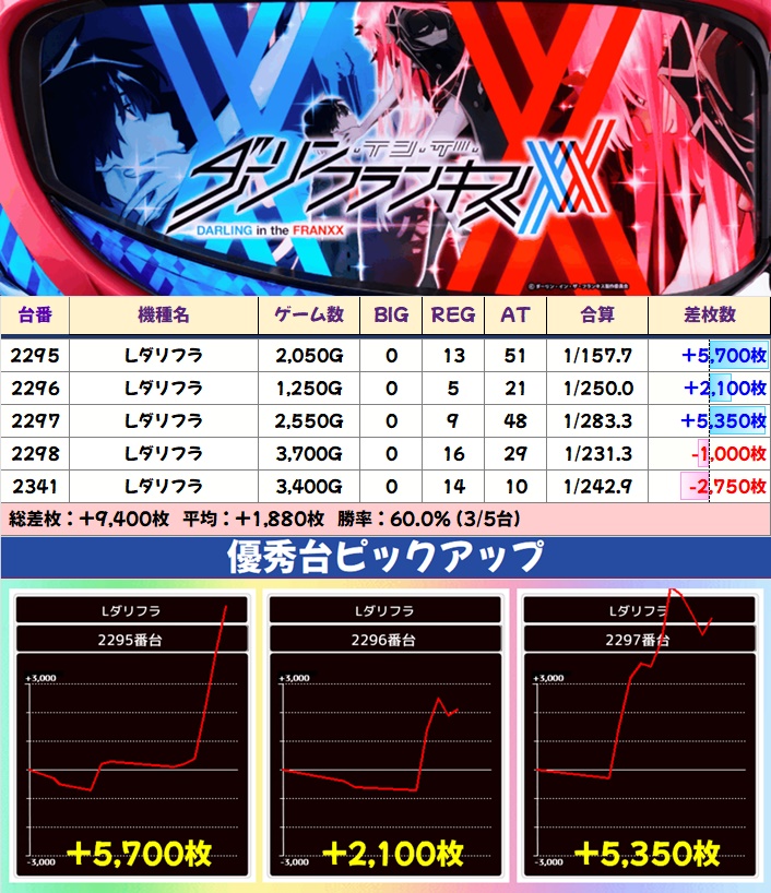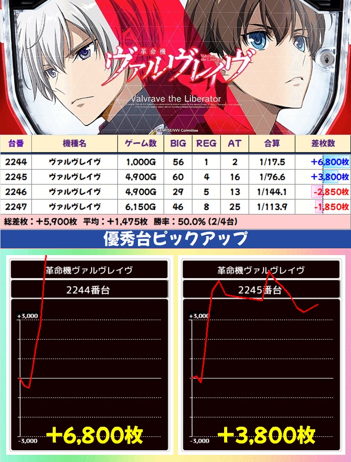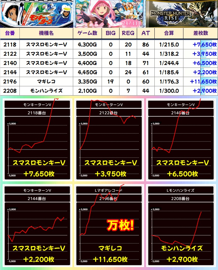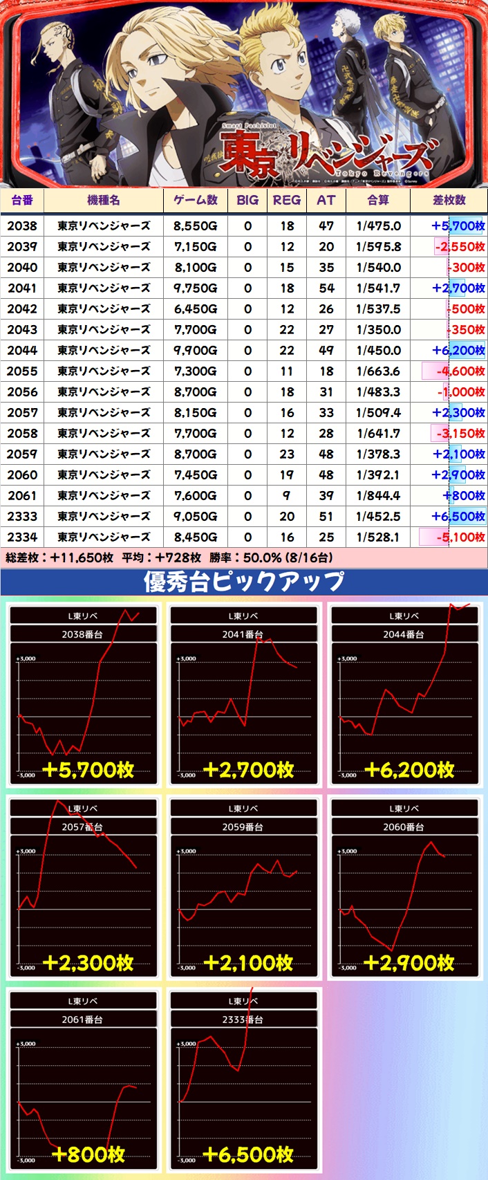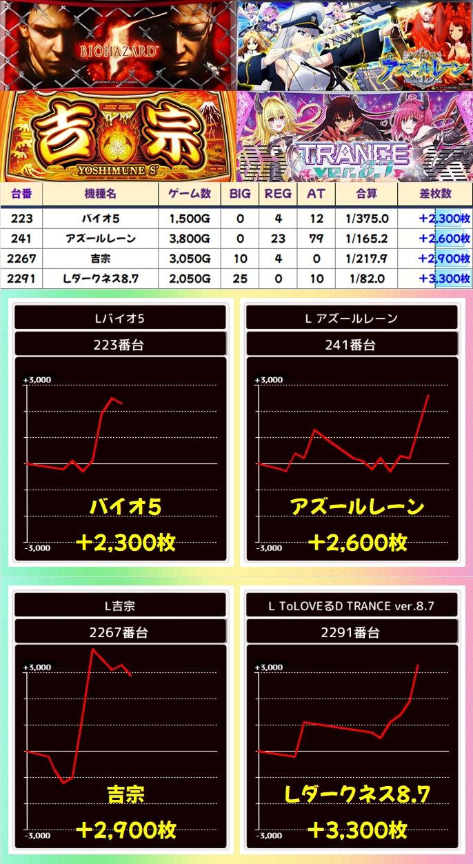ほかにも東京リベンジャーズ・Lダリフラ・ヴヴヴが1/2系濃厚となっており、ここからも多くの優秀台が出現。その他単品ではバイオ5・吉宗・Lダークネス8.7、バラエティのアズールレーンに+2,000枚オーバー台があったりと、どのエリアにもチャンスがある状況になっていました。
