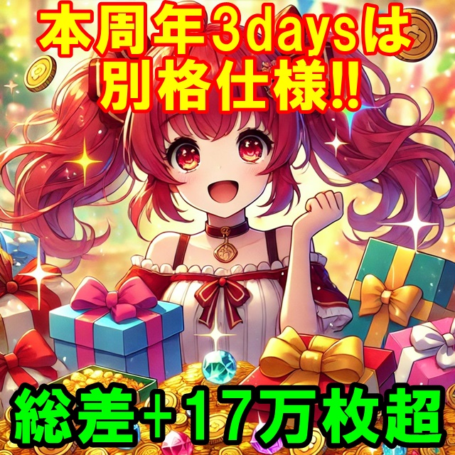 さらに今回は本周年の3daysということで、これまで以上に注力されること間違いナシ。連日のお宝大量投入に期待が高まりました。ギルドの前日ポストは下記の通り。