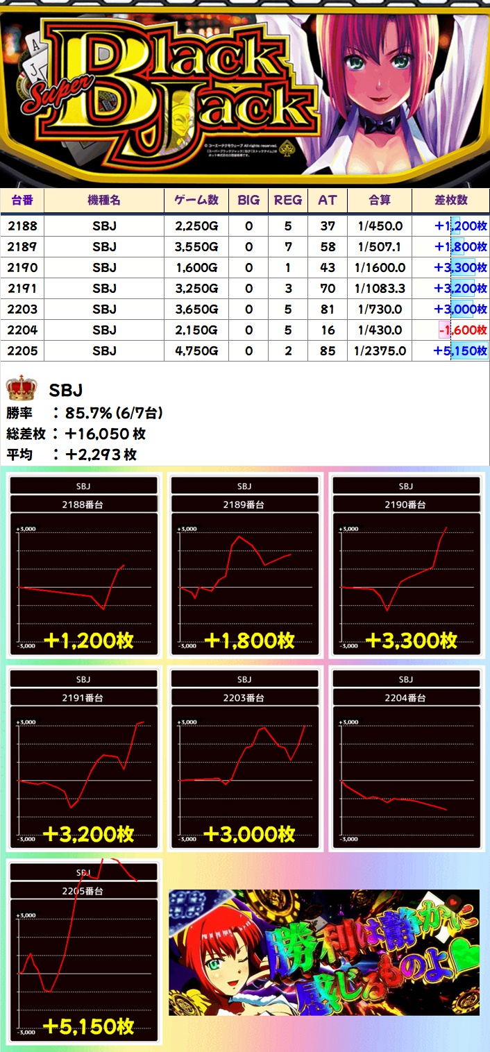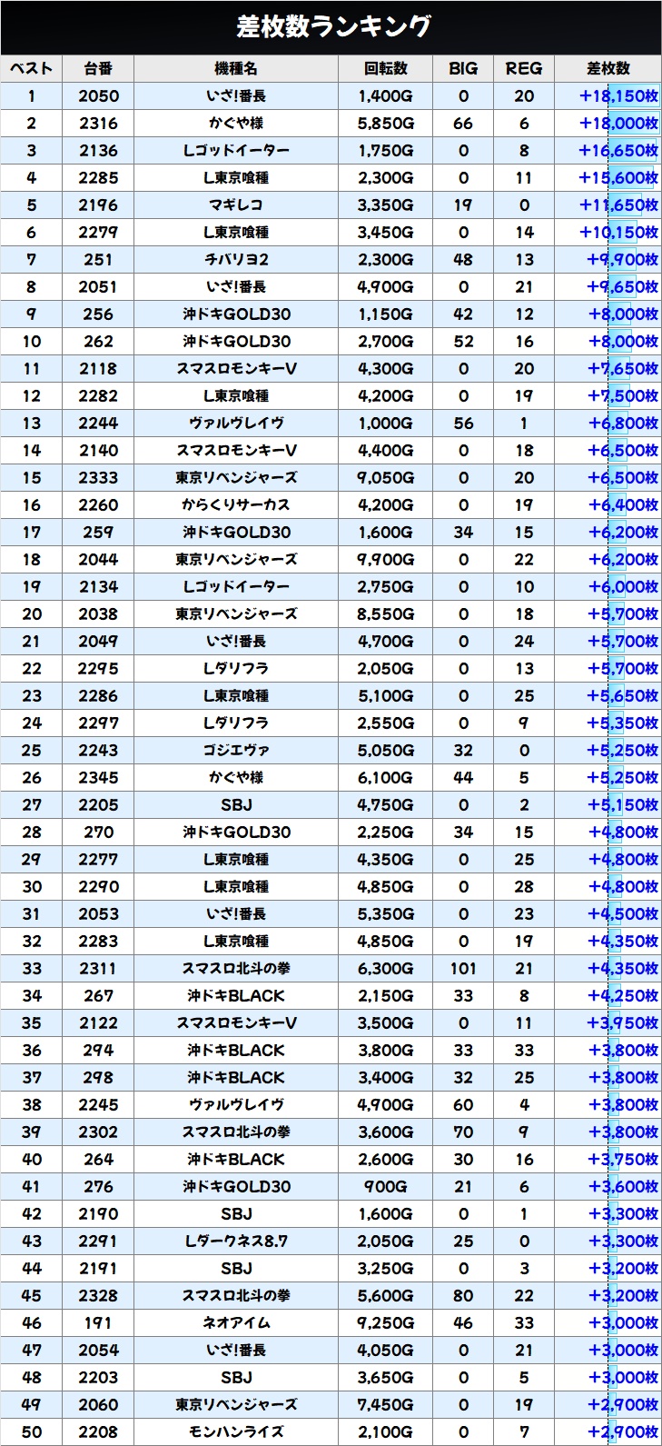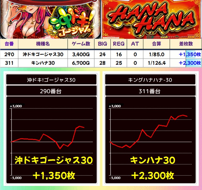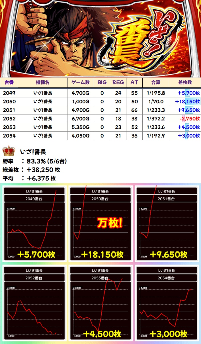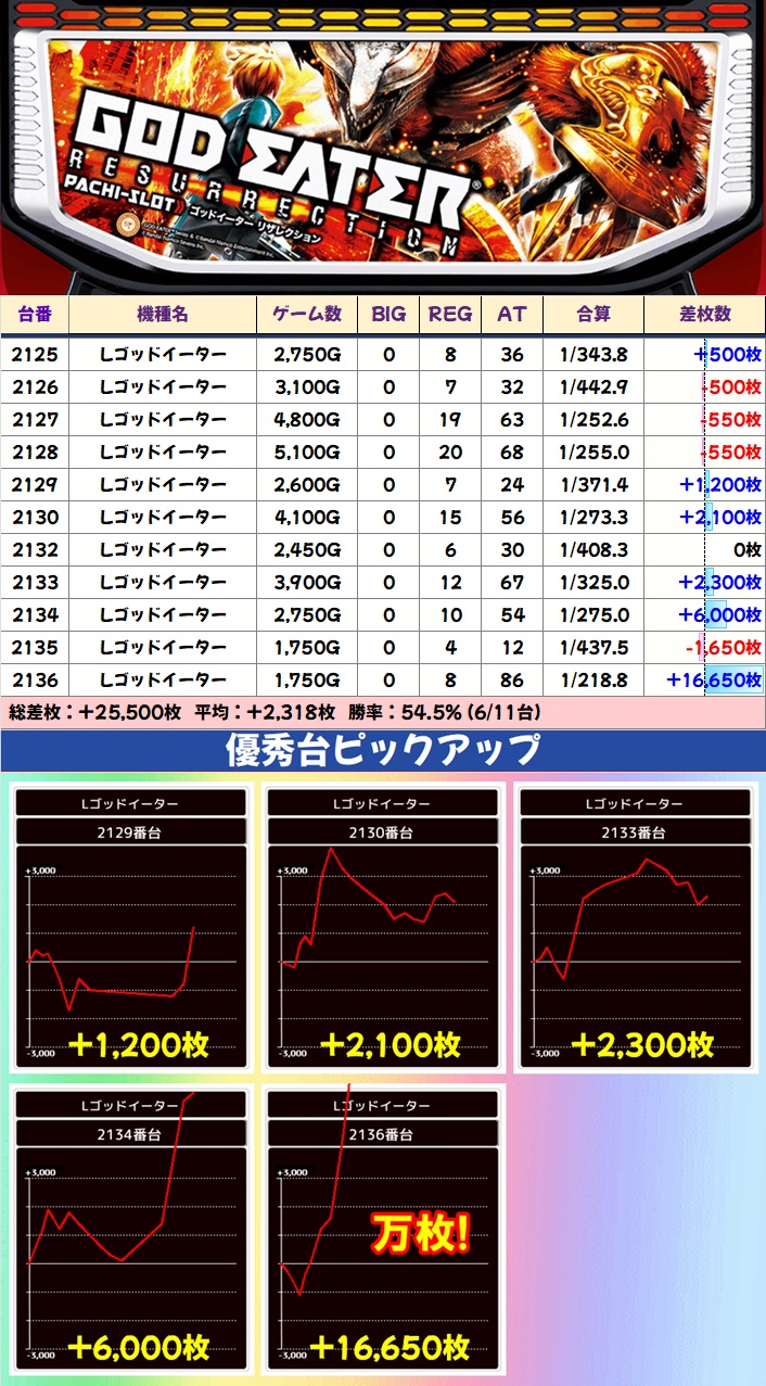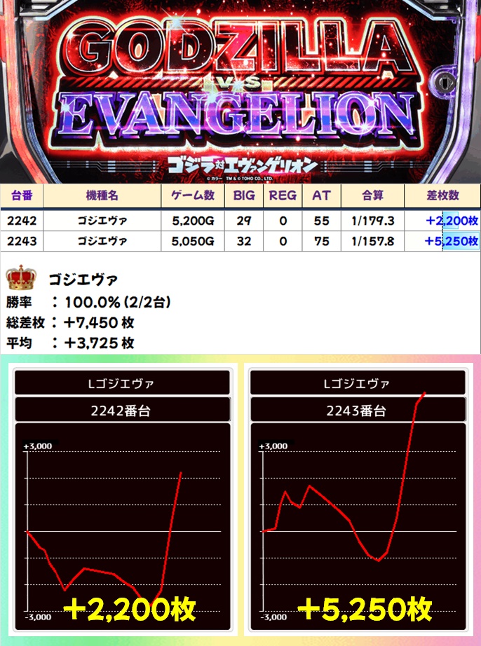 メイン機種以外にも優秀機種が盛りだくさん。いざ!番長・SBJ・ゴジエヴァは全台系濃厚と思われる結果で、いずれも平均差枚は大幅なプラスに。いざ!番長はコンプ台を含め大量出玉が続出し、平均+6,000枚オーバーというずば抜けた好成績を叩き出しました。