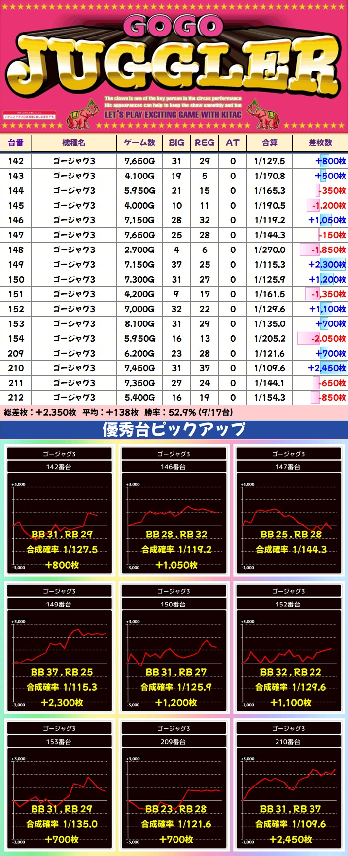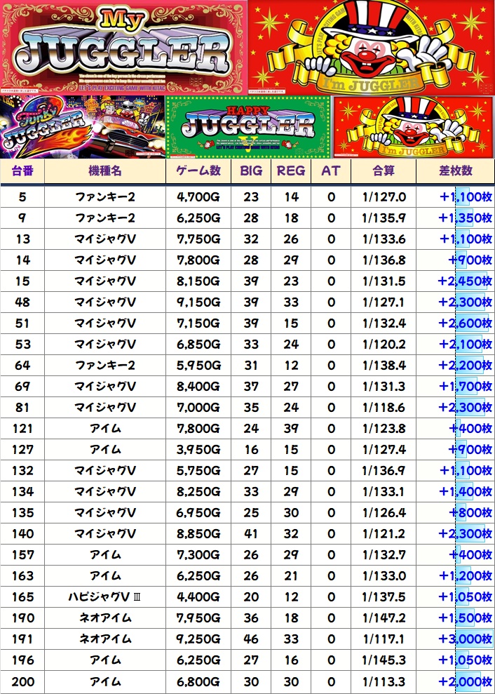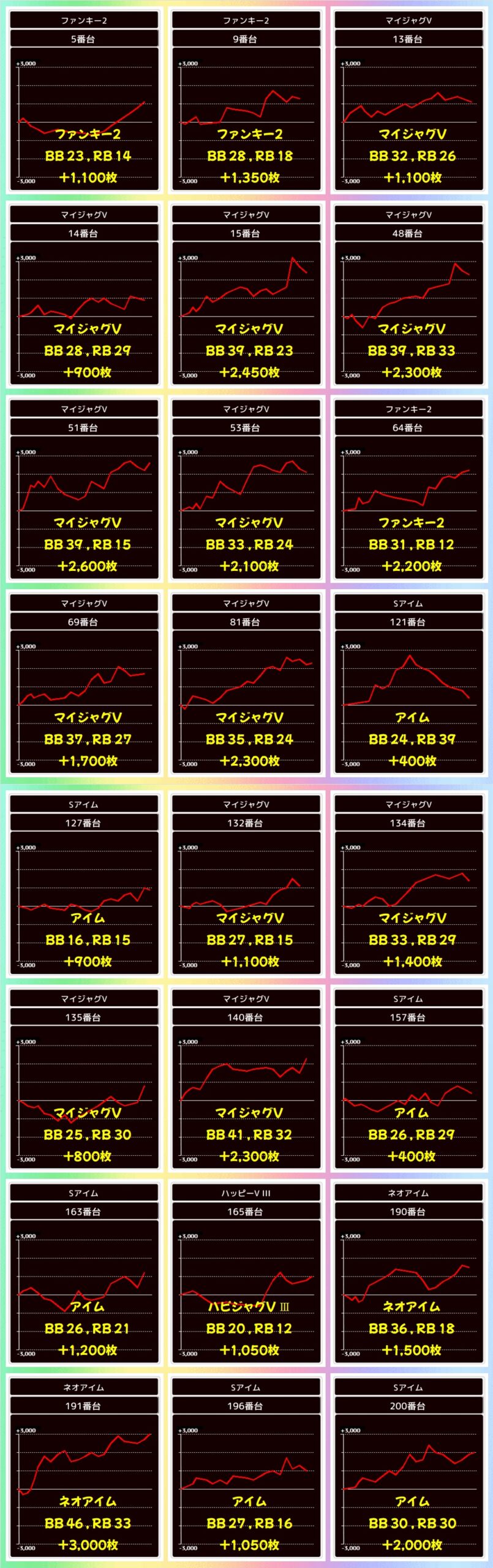 ジャグラーシリーズはジャグラーガールズ・ゴージャグ3が1/2系濃厚で、いずれも半数以上がプラス差枚でフィニッシュ。ほかにもメインのマイジャグV・アイムを筆頭に多くの優秀台が確認でき、幅広くお宝が散りばめられていた様子が窺えます。