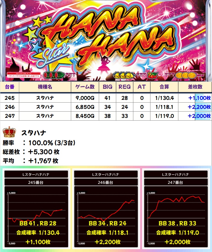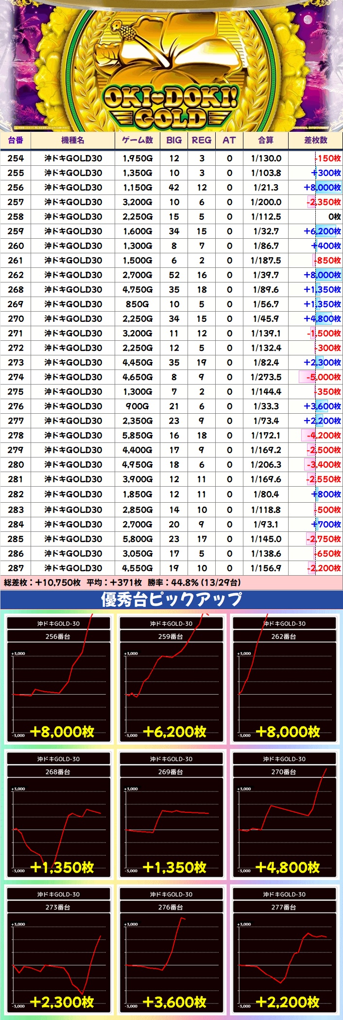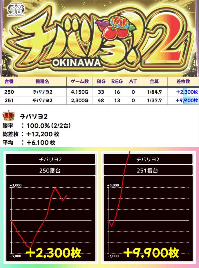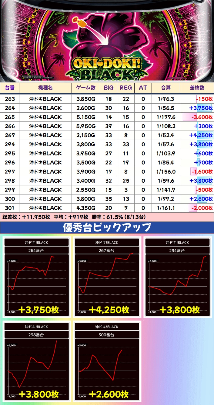 沖スロはチバリヨ2・スタハナが全台プラスで、前者は平均+6,000枚オーバーと絶好調。どちらも全台系だった可能性が高いです。沖ドキシリーズも好調で、沖ドキBLACKが1/2系濃厚、沖ドキGOLDも高配分と思われる結果でした。