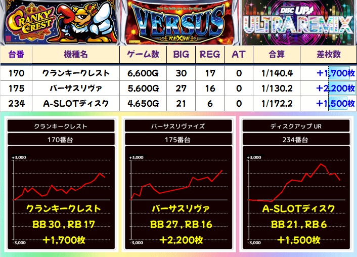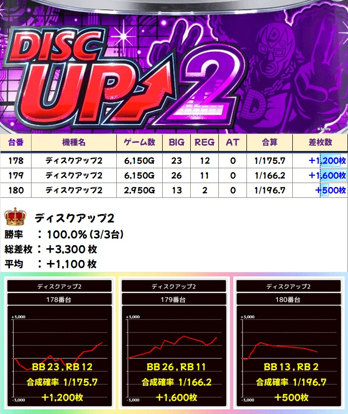 ノーマルではディスクアップ2が全台プラスで平均+1,000枚オーバーの好成績。低設定でも甘めな機種ですが、1/2系以上の仕掛けになっていたのではないかと思われます。単品ではクラクレ・バーサスリヴァ・A-SLOTディスクに優秀台があり、しっかり勝負できる仕掛けが用意されていました。