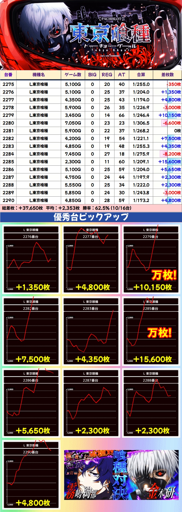 主力機ではゴッドイーターが1/2系濃厚で、万枚突破台を含め多くの優秀台が出現しました。毎日オススメ機種では東京喰種が1/2系濃厚で、こちらは万枚突破台が2台出現と絶好調。いずれも平均差枚は+2,000枚オーバーとかなり優秀でした。