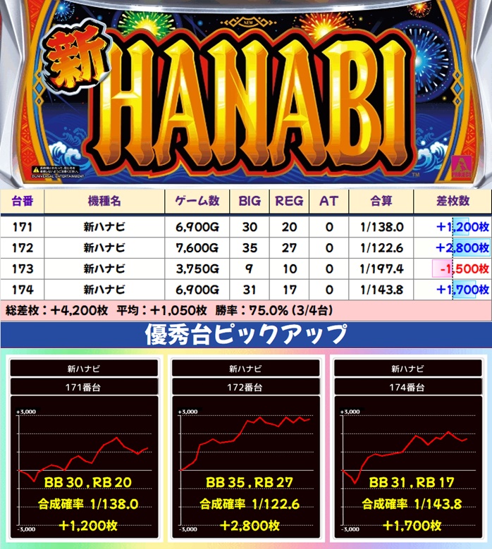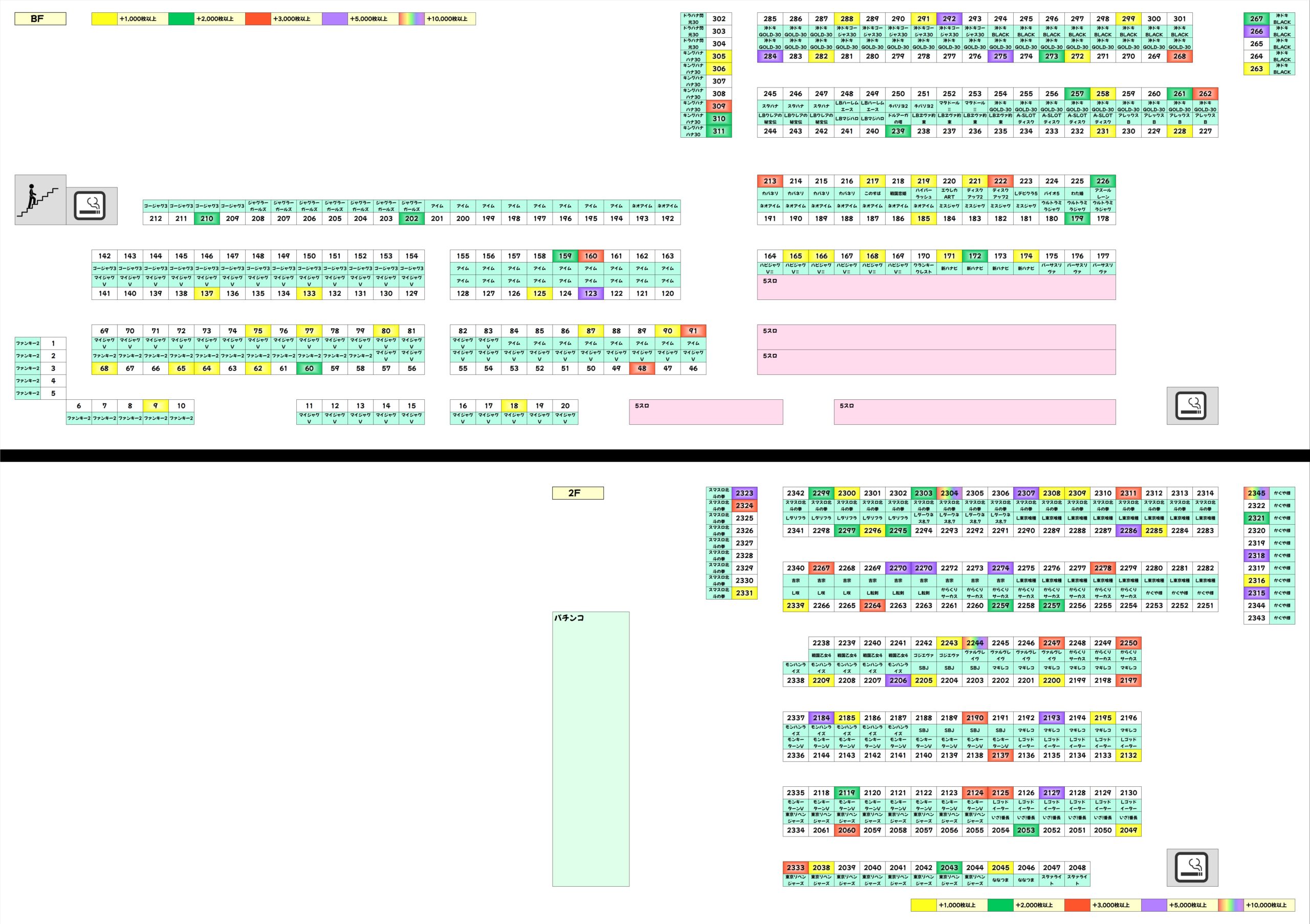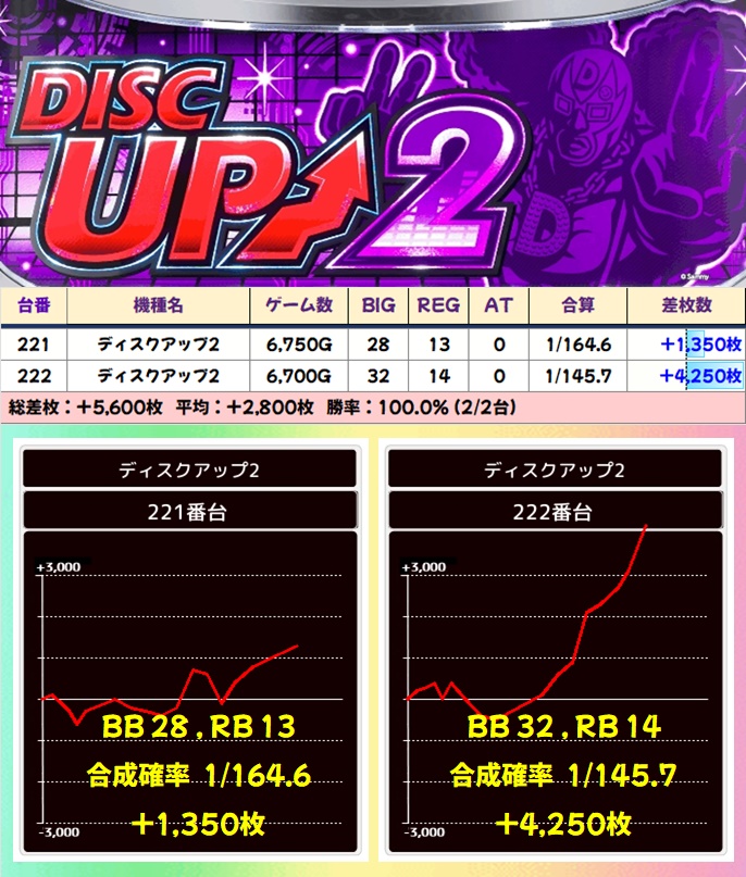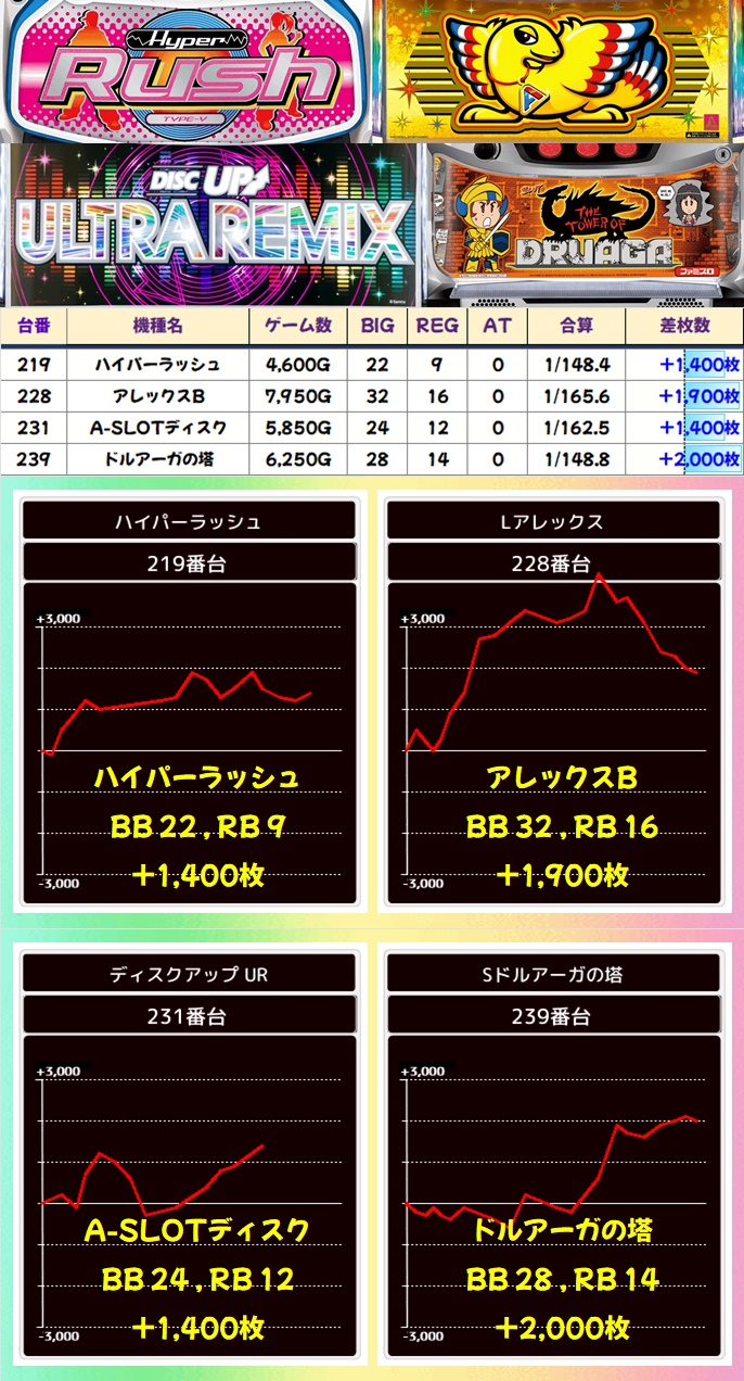 ノーマルでは新ハナビ・ディスクアップ2がニブイチ以上は当たりと思われる結果。単品も複数あり、新台のドルアーガの塔に+2,000枚の優秀台があったりと、しっかりお宝が用意されていました。甘めの機種にも抜かりない仕掛けがあるので、堅い勝負を好まれる方はココから攻めるのもアリです。