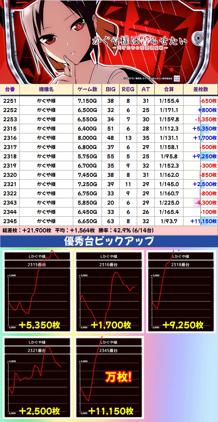 かぐや様からは+5,000枚オーバー台が3台出現し、そのうち1台が万枚突破。平均差枚は+1,500枚オーバーと優秀でした。全台稼働良好かつ概ね半数がプラスになっていたことから、ニブイチ仕掛けだった可能性が高いです。