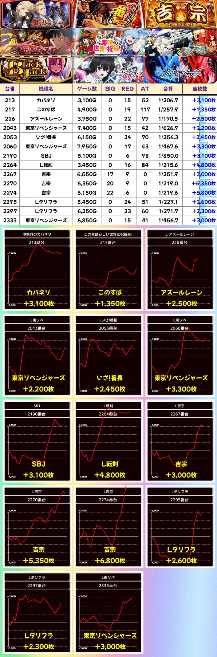 ほかにも様々な機種から大量出玉の優秀台が出現。吉宗・東京リベンジャーズには+3,000枚オーバー台が複数あり、カバネリ・SBJ・L転剣などにも爆裂台が確認できました。今回も人気機種を中心に幅広くお宝が散りばめられていた様子が窺えます。