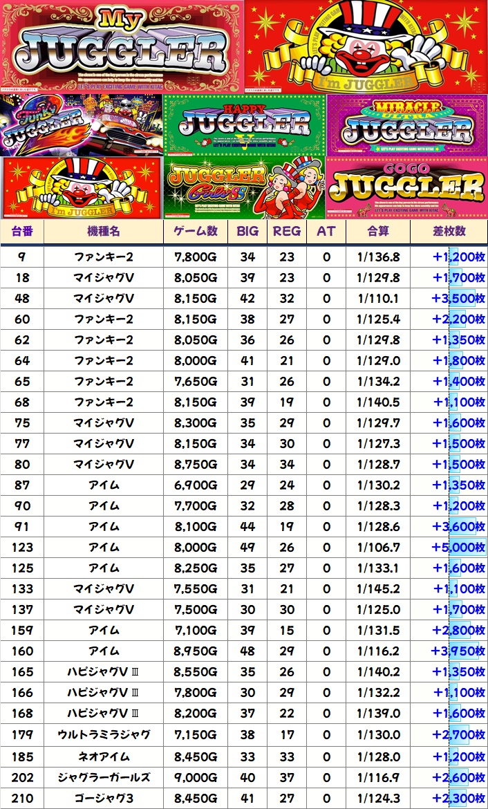 紹介した台以外にも合算良好台は多く見受けられ、なかには高配分になっていた機種もあったと思われます。7のつく日のジャグラーはかなり強いので、堅い勝負がしたい方はココから攻めるのがオススメです!
