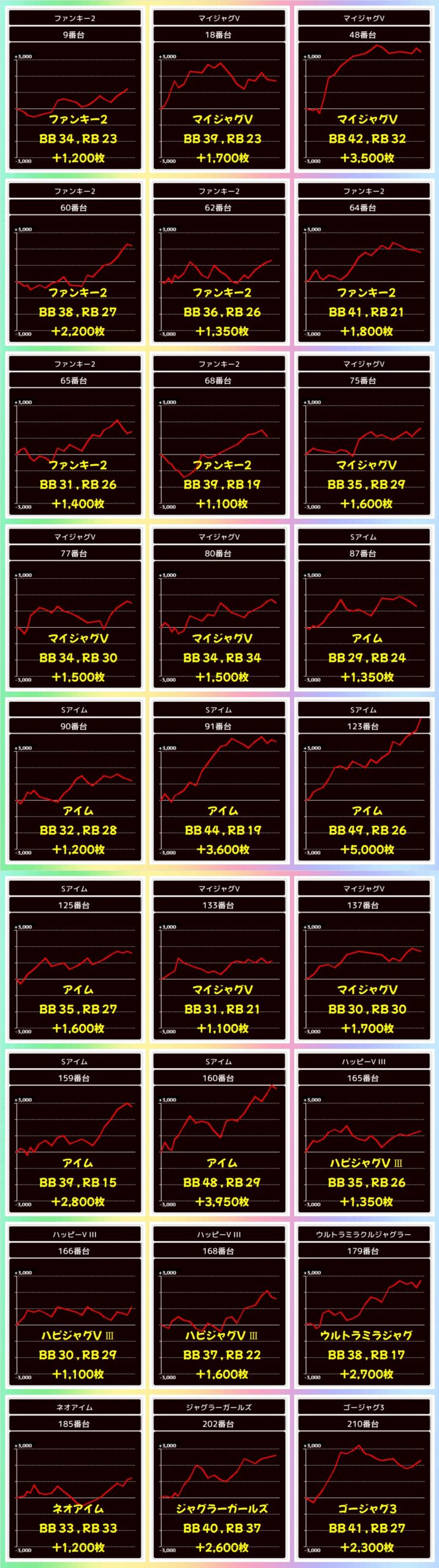 今回もジャグラーコーナーには満遍なくお宝が散りばめられており、+1,000枚オーバーの優秀台が全部で27台出現しました。メインのマイジャグV・アイムには+3,000枚オーバー台があり、アイムには+5,000枚をお持ち帰りした台も。質の高さにもバッチリ期待できる状況でした。