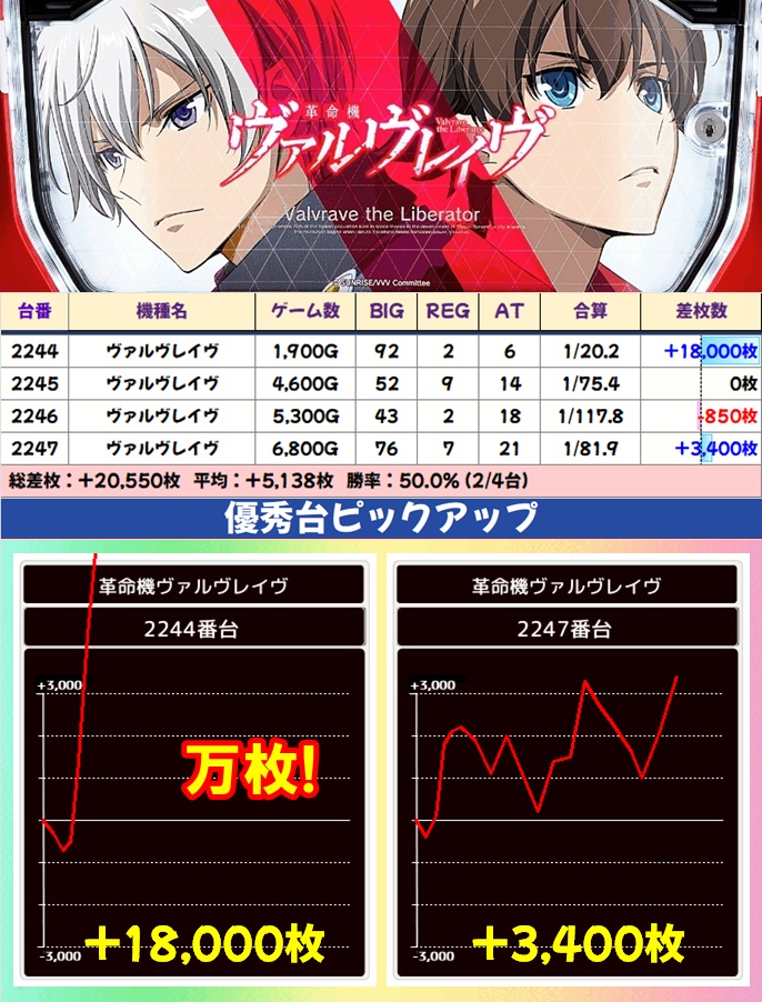 ヴヴヴは4台中2台がプラスで、2244番台がコンプリート達成。平均差枚は+5,000枚オーバーという素晴らしい結果でした。プラス域に届かなかった台も含め稼働が良かった様子を見るに、全体的に高配分になっていた可能性が高いです。
