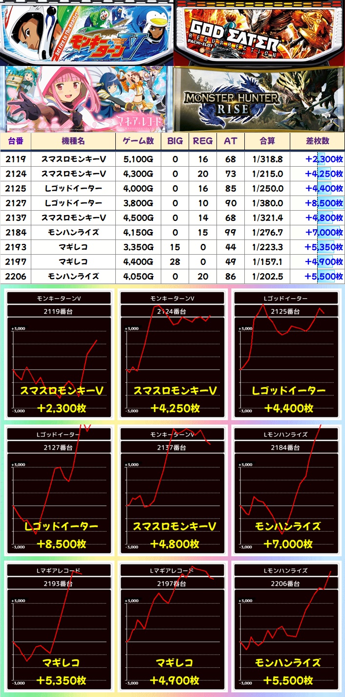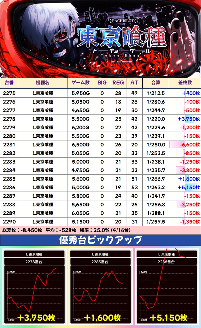 東京喰種からは+3,000枚台、+5,000枚台の優秀台が出現。こちらも全体的に稼働良好だったので、何かしらの示唆が確認できていた可能性大。全体結果こそ振るいませんでしたが、高配分になっていたのではないかと思われます。