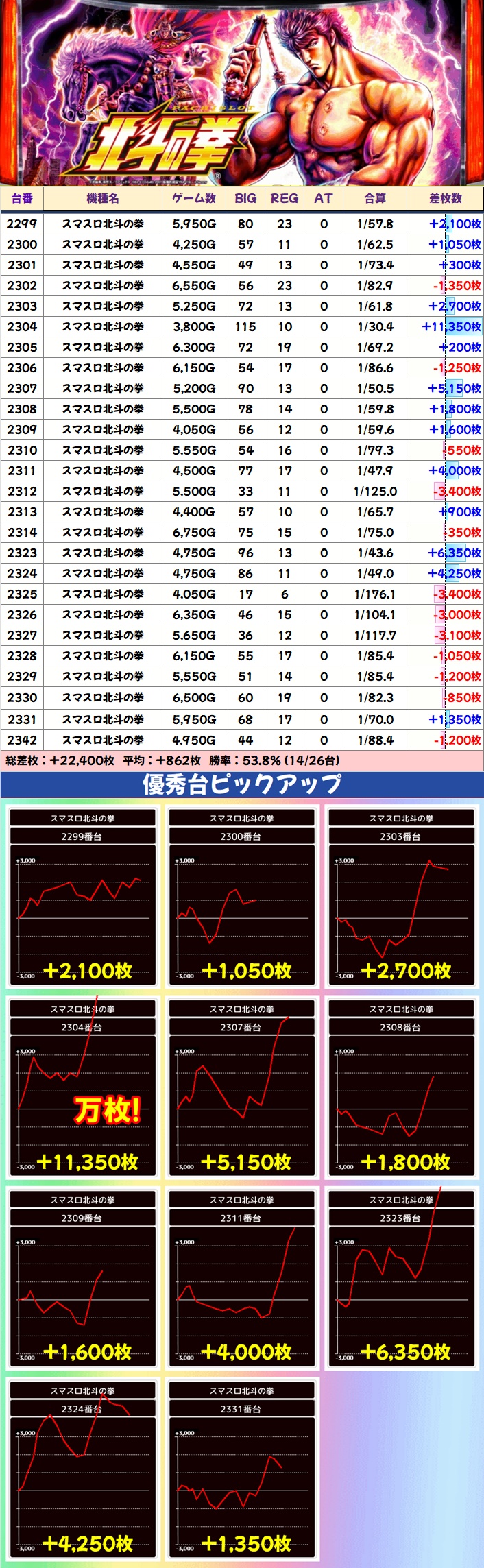 スマスロ北斗は26台中14台がプラスで平均+862枚と好調。+4,000枚以上の爆裂台が5台あり、万枚突破台も確認できたりと、今回も注力されていた様子が窺えました。7の日のスマスロ北斗は超高確率で仕掛けがあるので、次回以降も積極的に狙っていきましょう。