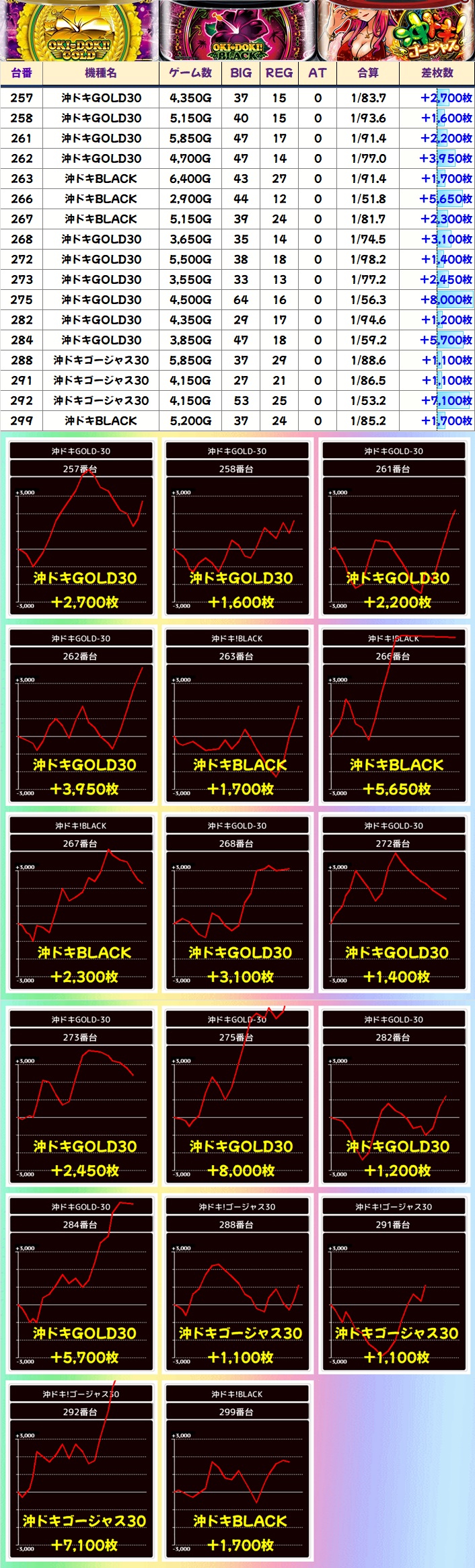 沖スロコーナーはキンハナが1/2系濃厚で平均+1,000枚オーバーの好成績。沖ドキシリーズからも優秀台が続出し、それぞれに+5,000枚オーバーの優秀台が確認できました。沖スロといえば3・9のつく日に強化傾向が見受けられますが、7のつく日も何かしらの仕掛けがあるので見逃せません!