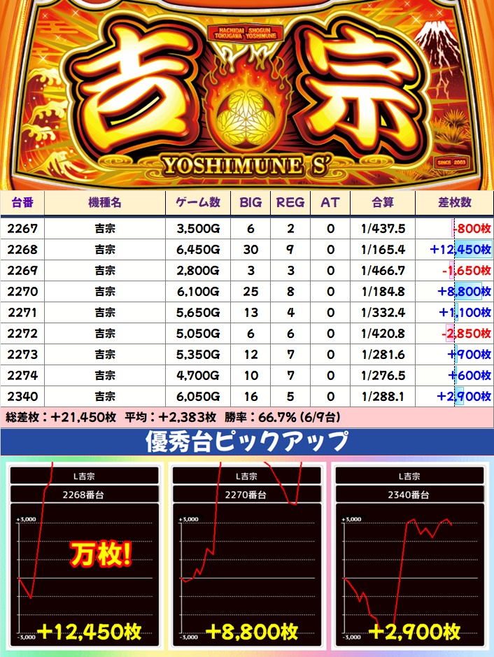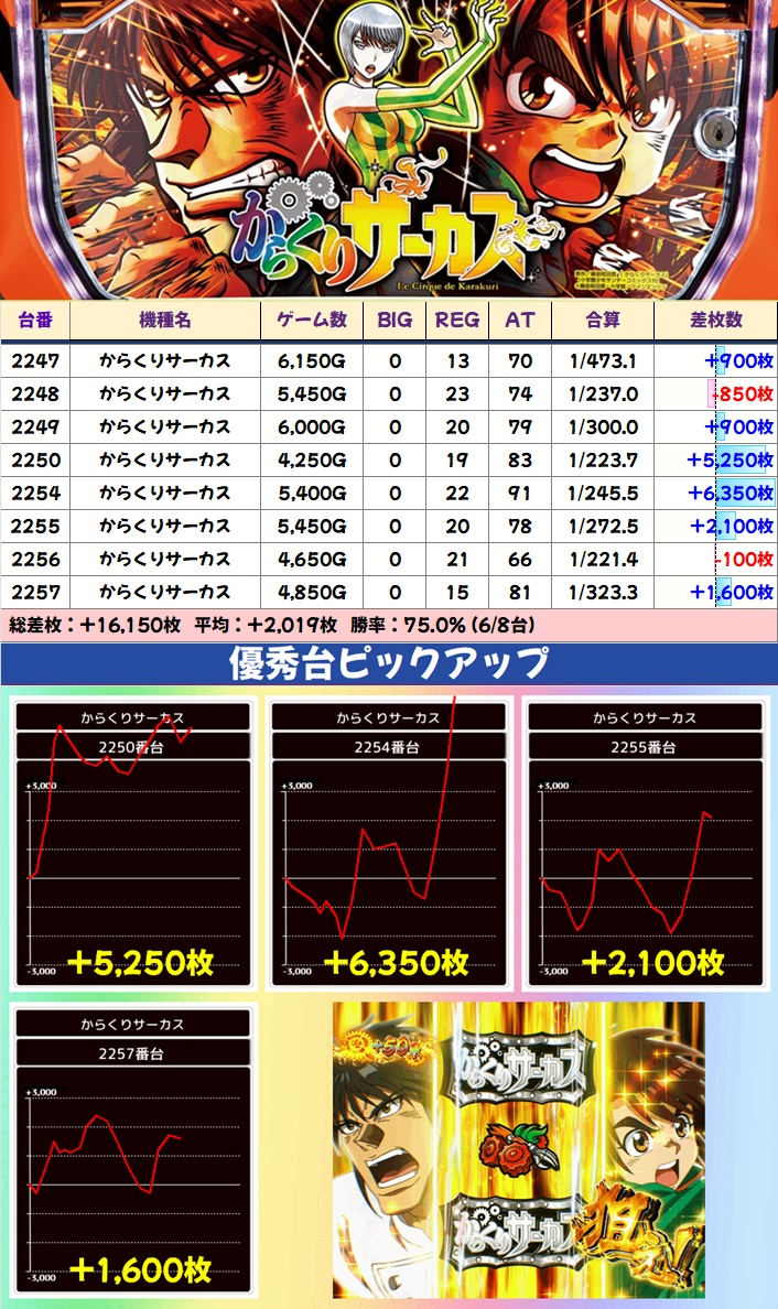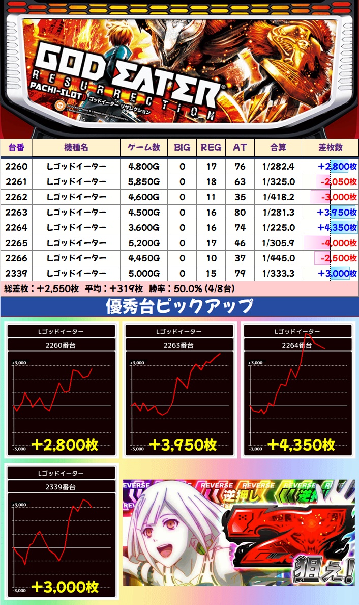 今回は50台以上が+3,000枚オーバーで、4台が万枚突破。これだけの多くの仕掛けが用意され、大量出玉の優秀台が続出したとなれば総差枚+15万枚オーバーという結果にも納得ですね!
