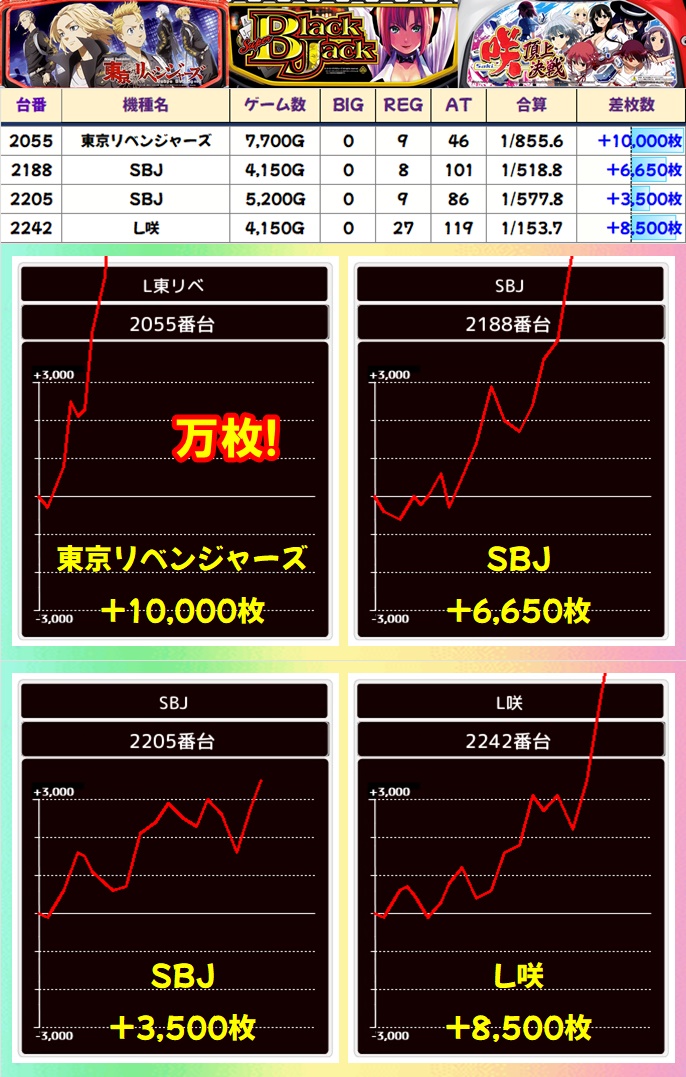 単品では東リべに万枚突破台があったほか、L咲から+8,000枚オーバーが、SBJに+3,000枚&+6,000枚オーバー台があったりと、様々な機種で優秀台を確認。メインどころから少台数機種まで幅広くチャンスのある1日になっていました。