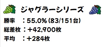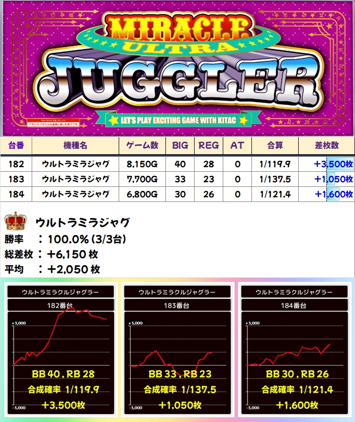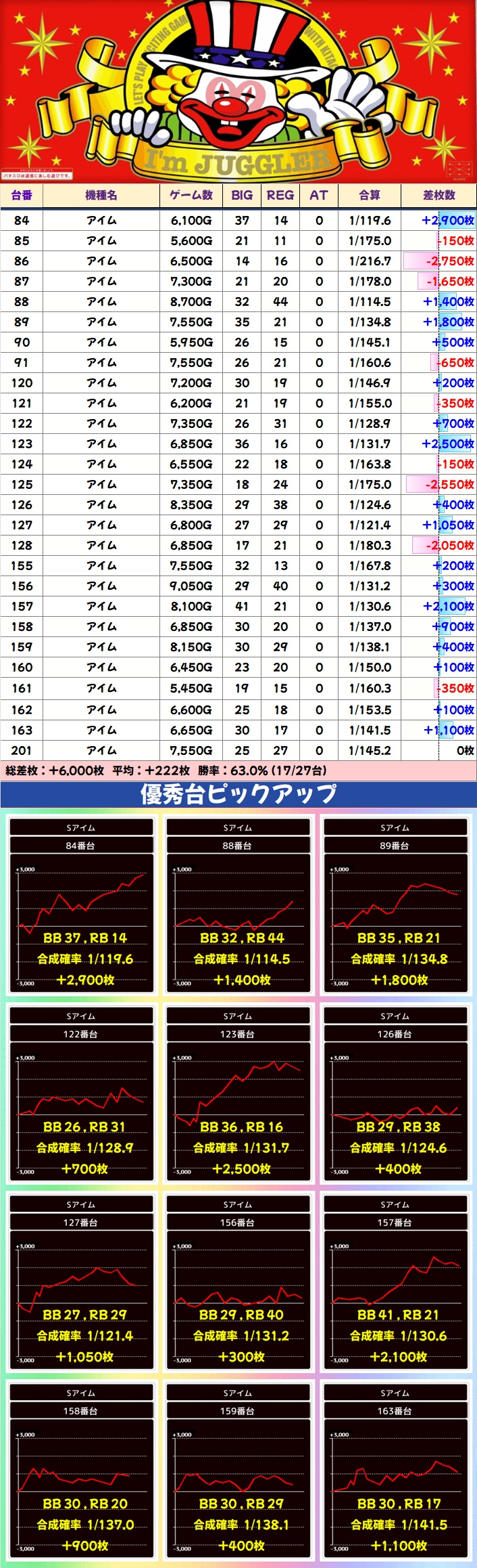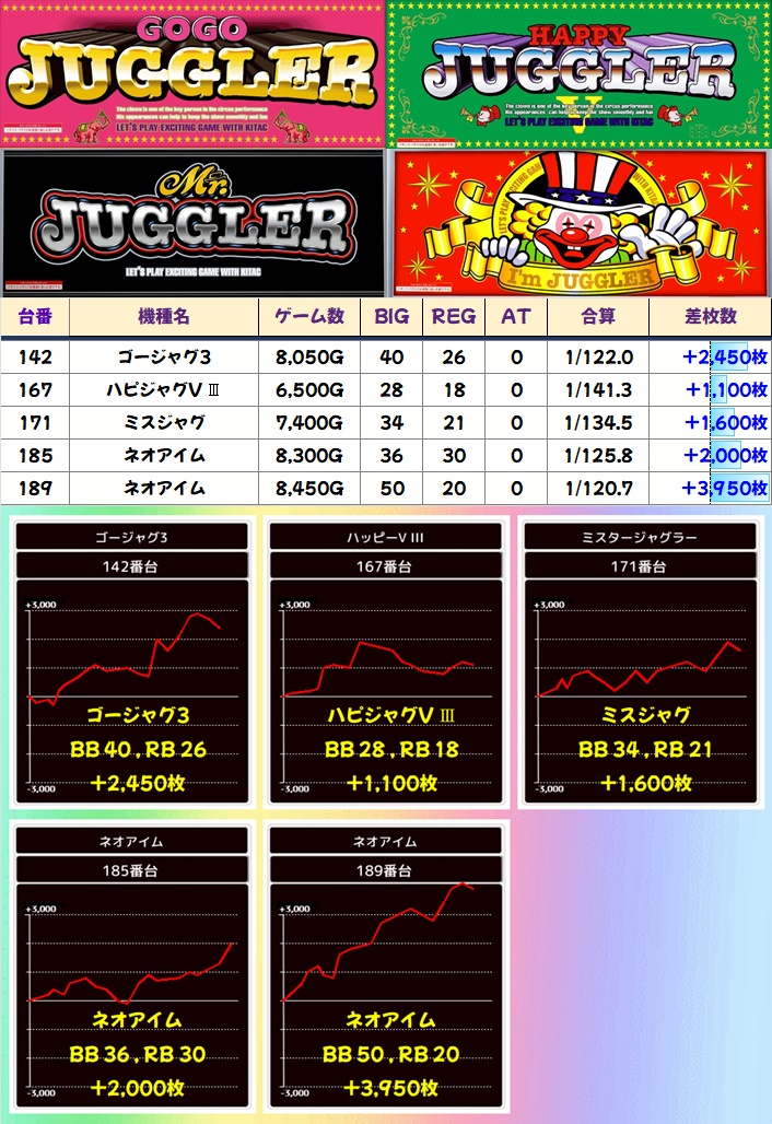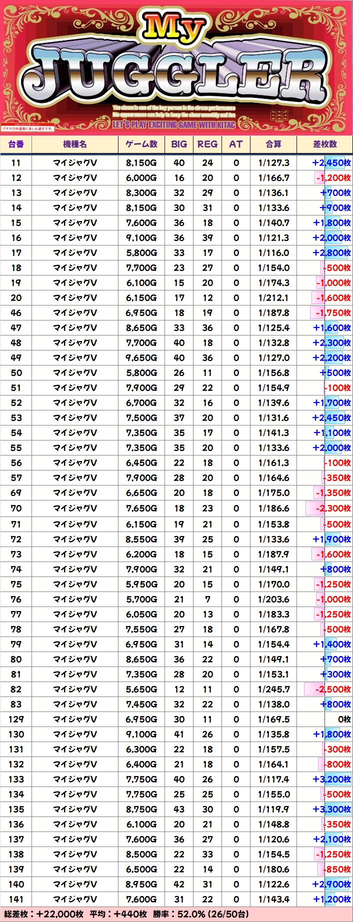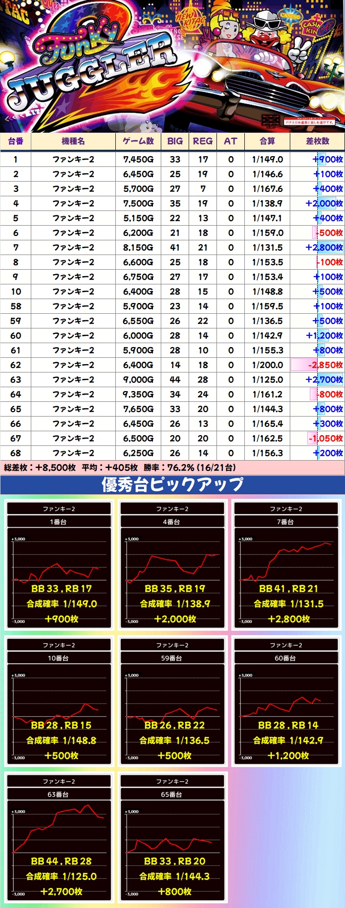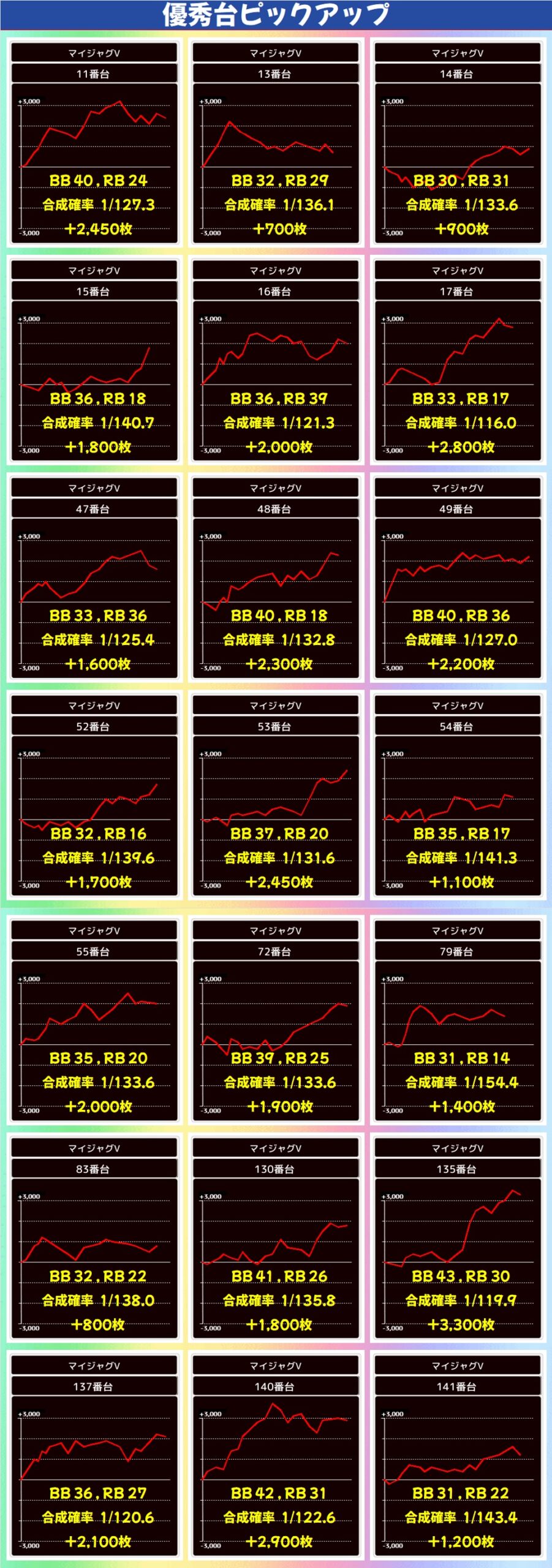 少台数のウルトラミラジャグが全台系濃厚で平均+2,000枚オーバーの好成績。最も台数の多いマイジャグVは1/2系濃厚となっており、機種単体で総差枚+2万枚オーバーとしっかり出ていました。ほかにもアイム・ファンキー2・ジャグラーガールズが高配分と思われる結果で、各々平均差枚はプラスに!