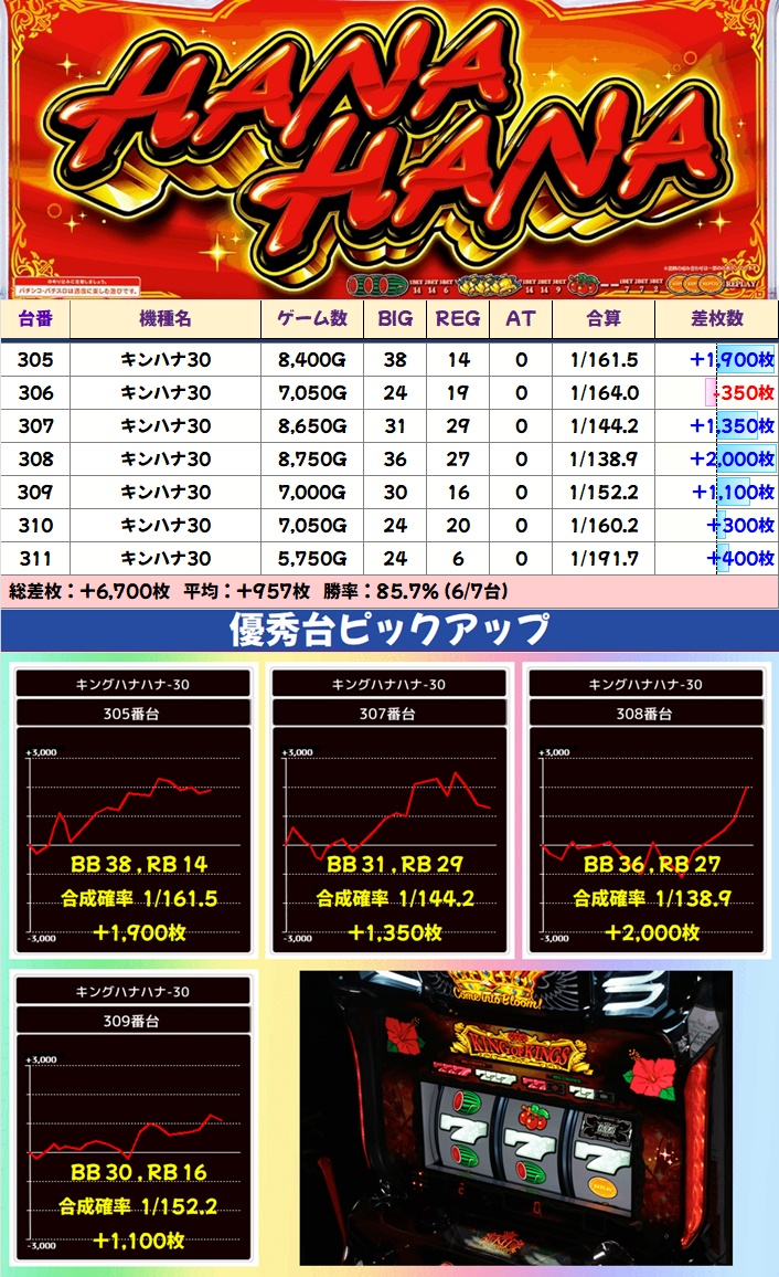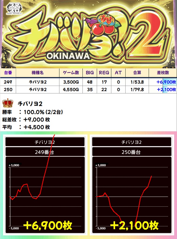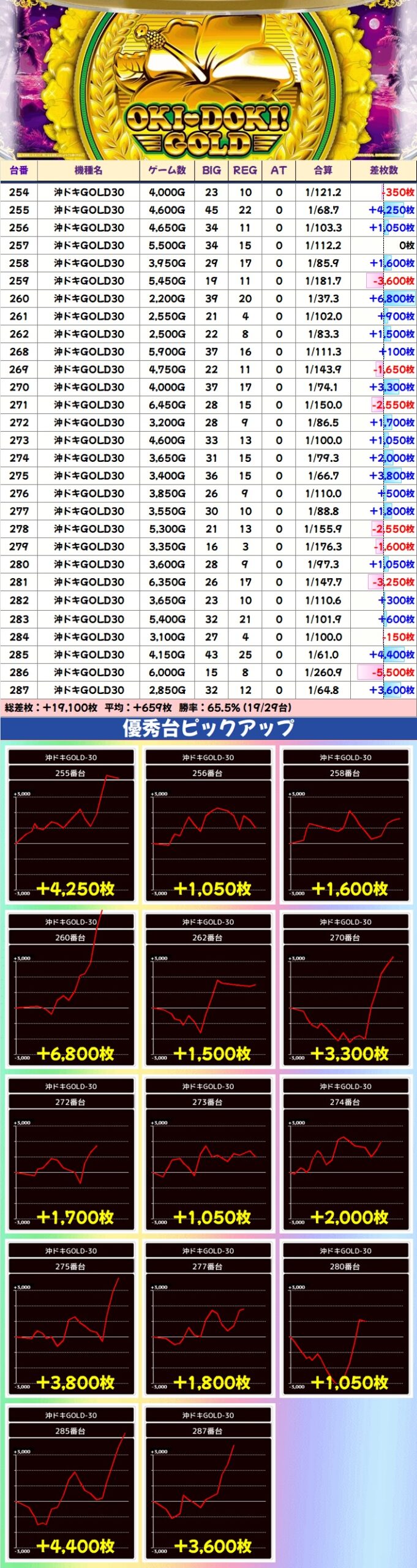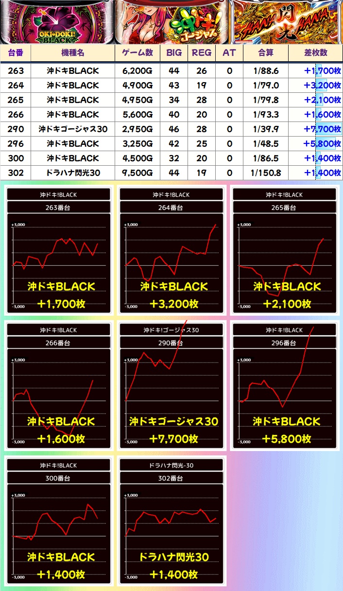今回はチバリヨ2が全台系濃厚で平均+4,500枚と大爆発。キンハナ・沖ドキGOLDも全体的に高配分と思われる結果で、勝率はかなり高めになっていました。その他沖ドキシリーズ・ドラハナ閃光にも単品の優秀台が確認でき、沖ドキコーナー全体が賑わっていました。