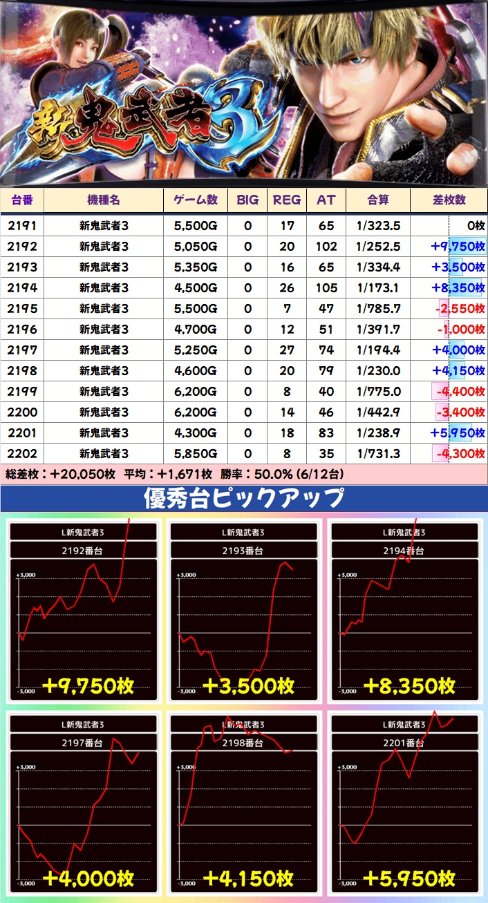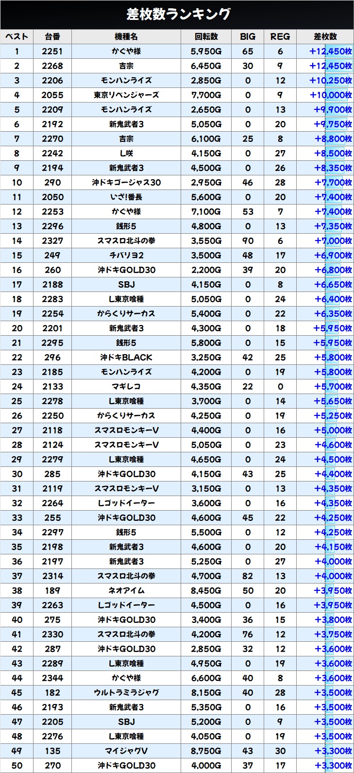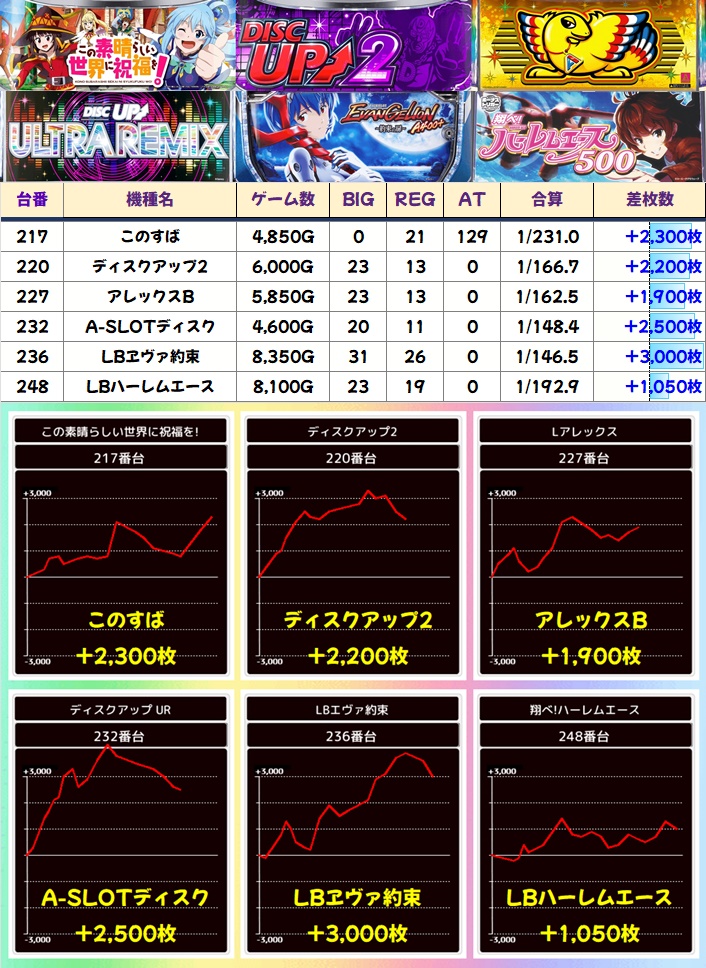 その他の機種からも+1,000枚オーバーの優秀台が確認でき、シリーズ全体に満遍なくお宝が散りばめられていたようです。少台数機種は高配分になりやすく、多台数機種は列や並びといった塊での仕掛けが頻発傾向にあるので、好調機種はもちろん、好調台の隣も要チェック!