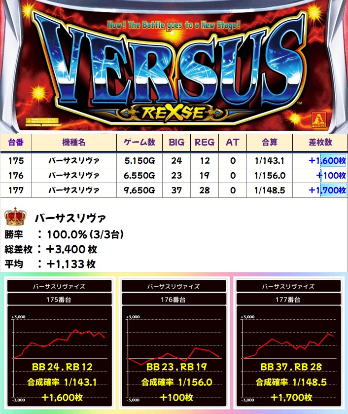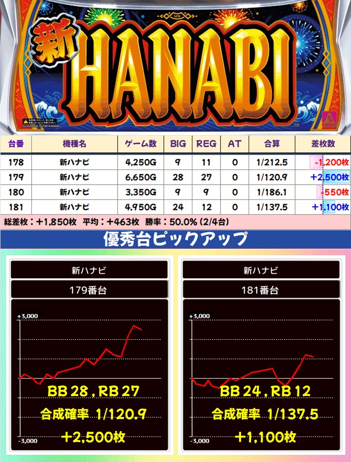 ノーマルではバーサスリヴァが全台系濃厚で平均差枚+1,000枚オーバー。新ハナビが1/2系濃厚で2台が+1,000枚オーバーをお持ち帰りしました。単品ではディスク2・Aスロディスクから+2,000枚オーバー、LBエヴァ約束に+3,000枚オーバーが出現したりと、ガッツリ粘れるお宝台が多数見受けられました。