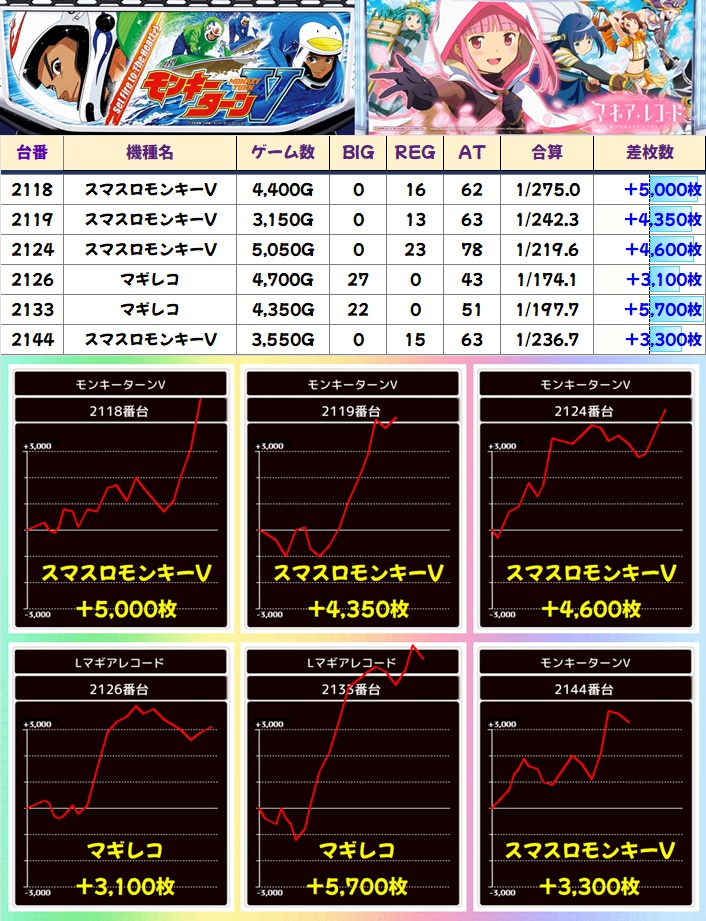 ご覧の通り今回も幅広い仕掛けになっていたので、悪番でも戦える状況になっていました。チャンスは豊富にありますが、スマスロで打つ台に迷った際は必ず当たりのある主力機のモンキーV・マギレコ・モンハン・ゴッドイーター、毎日オススメの北斗・東京喰種・かぐや様・からくりから狙ってみてください。