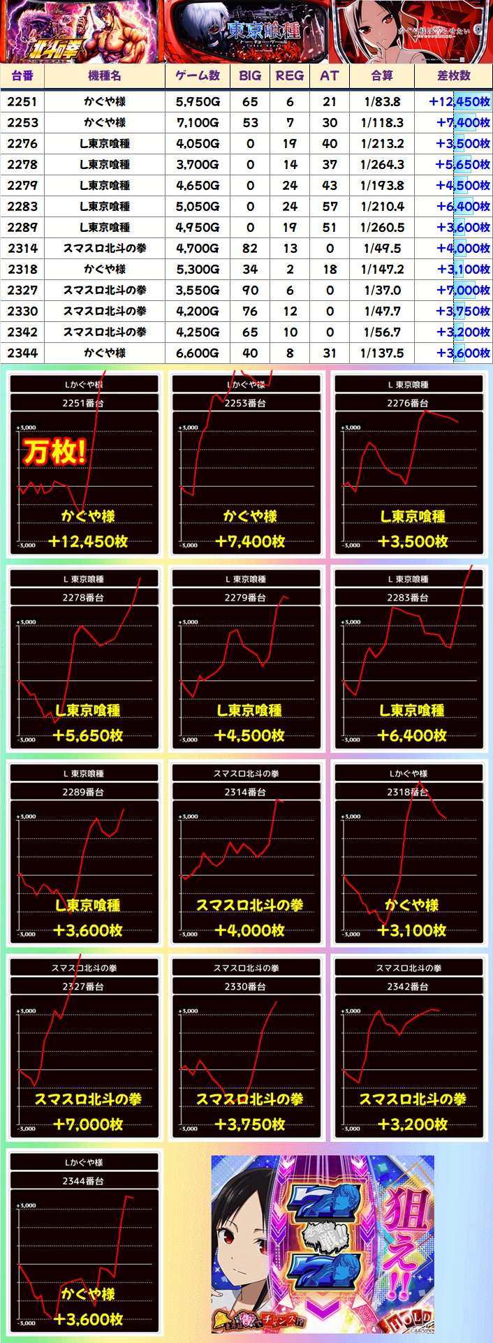 ほかにも各機種に単品の優秀台が確認でき、かぐや様からは万枚突破台も出現。主力機・毎日オススメ機種には必ず仕掛けがあるうえ単品も多めに用意されているので、どの機種も狙い目ですよ!