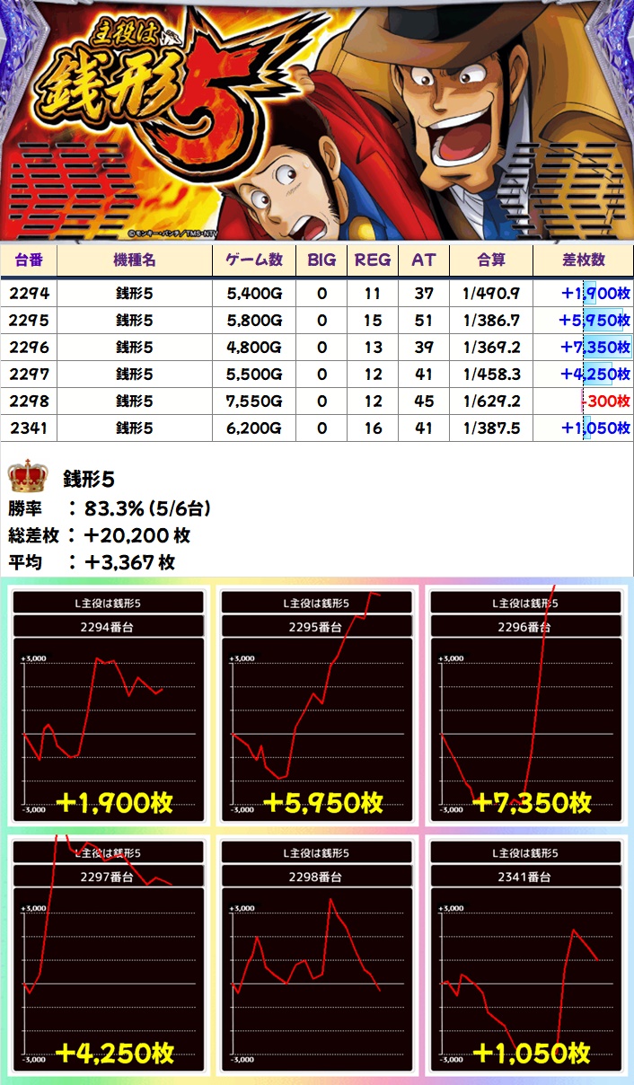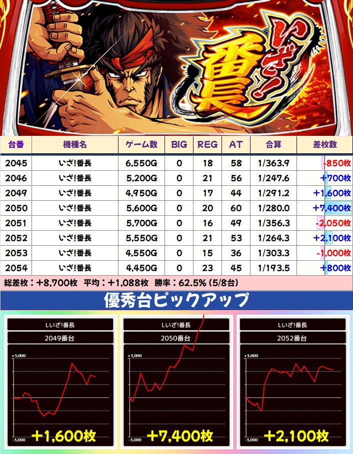 この日は新台の銭形5が全台系濃厚、新鬼武者3が1/2系濃厚となっており、新しめの機種にもしっかり仕掛けが盛り込まれていました。それ以外では人気の吉宗・いざ!番長が1/2系濃厚で、前者からは万枚突破台も出現しました。