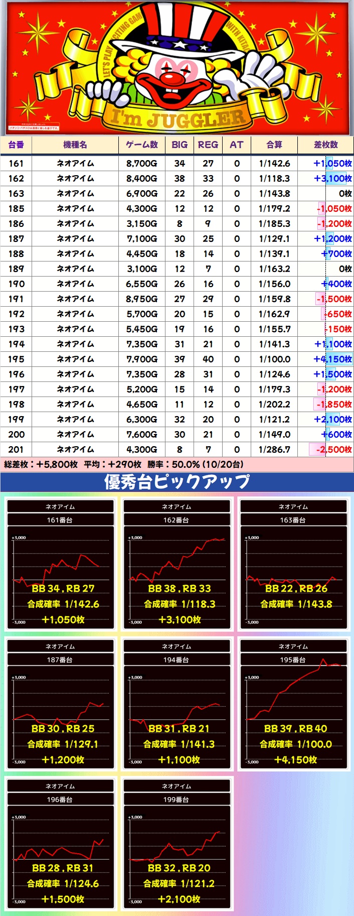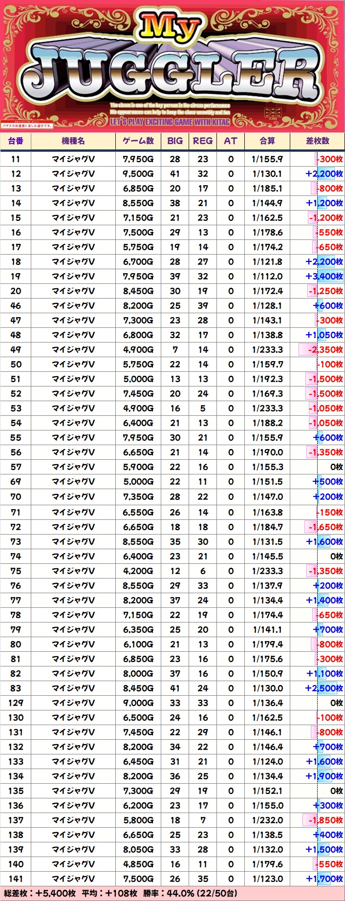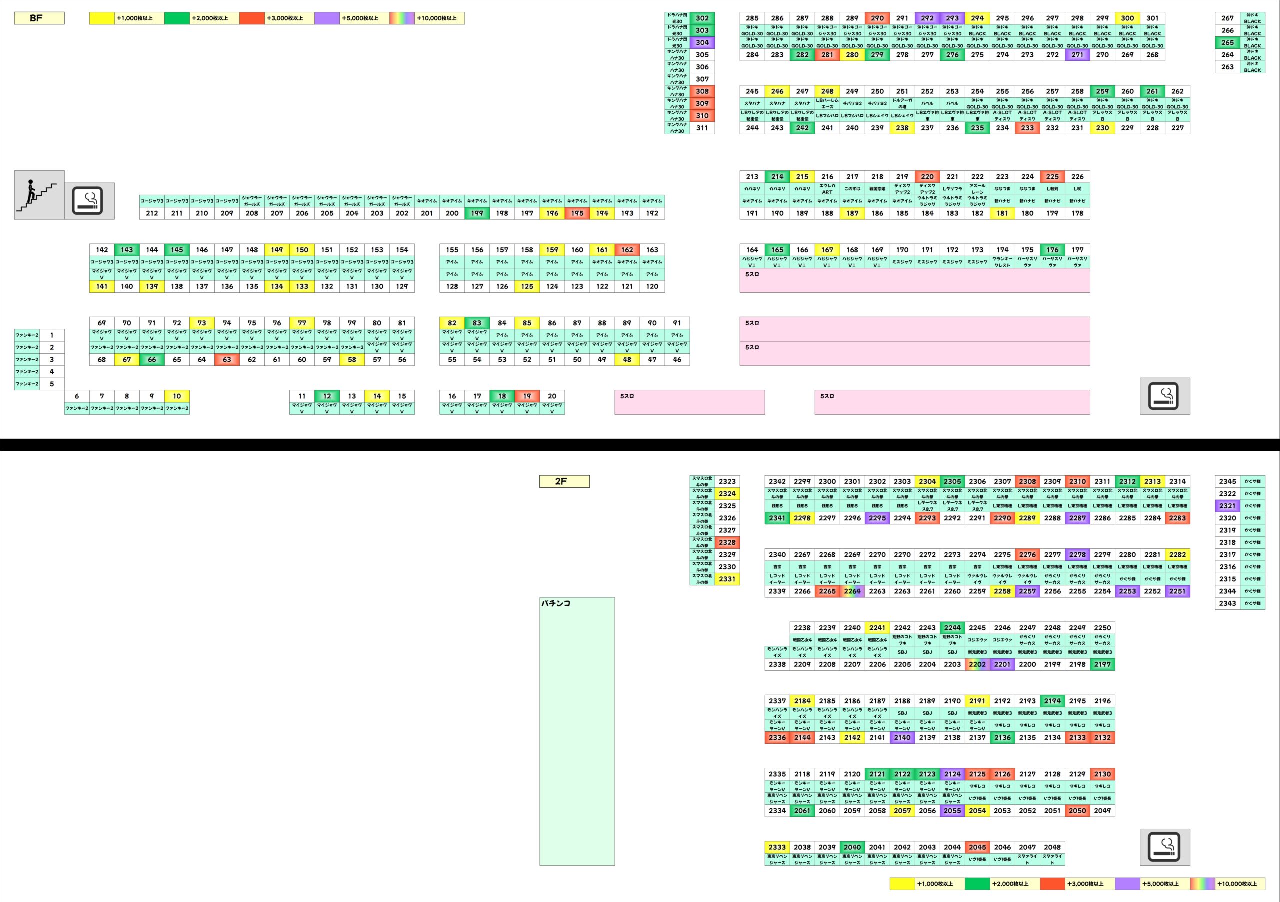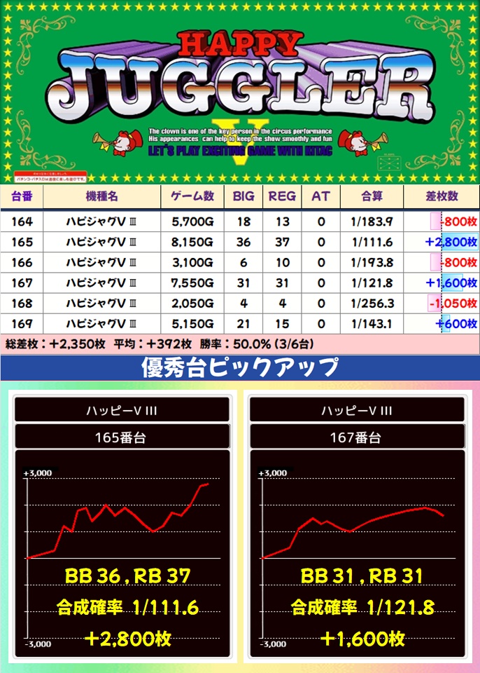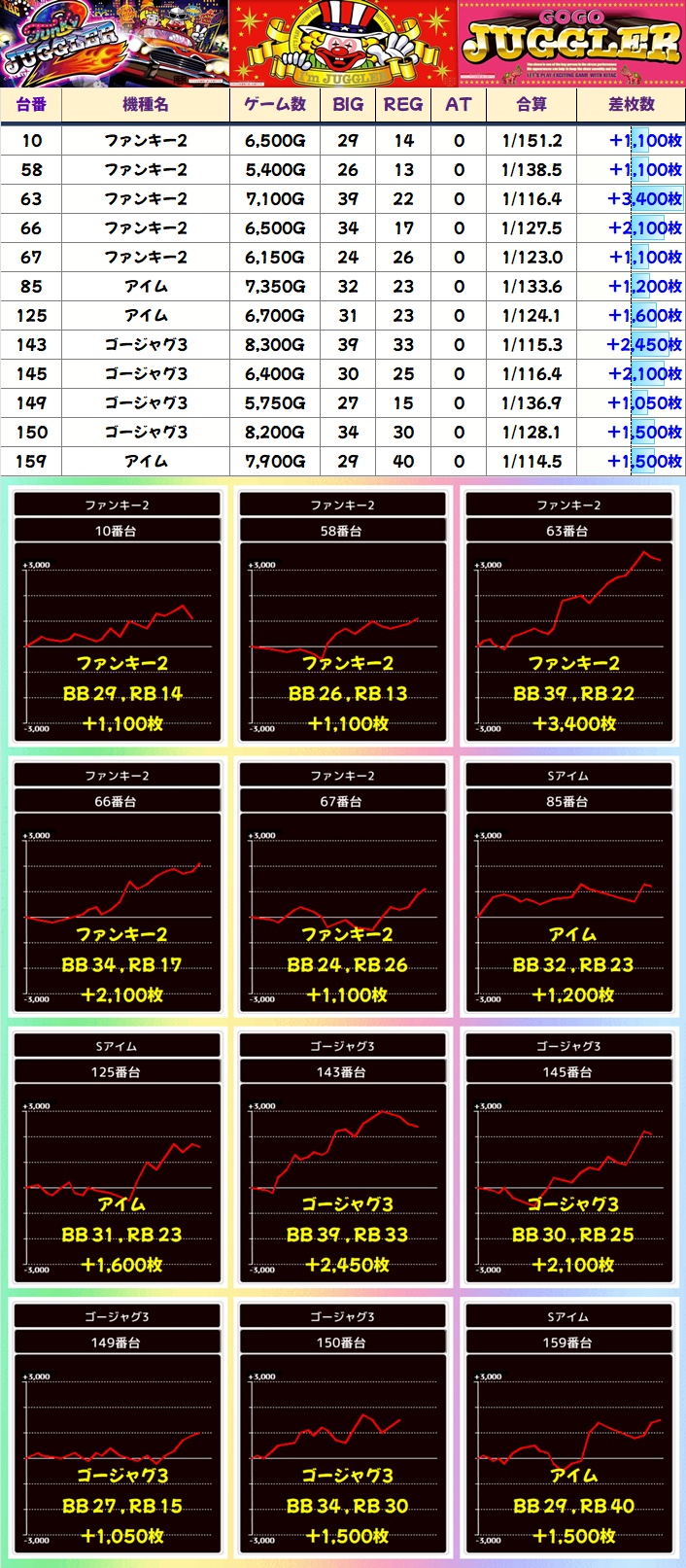 ジャグラーシリーズではネオアイム・ハピジャグが1/2系濃厚、マイジャグVが高配分と思われる結果。この3機種は勝率が高めで、合算良好台も多数見受けられました。その他ファンキー2・アイム・ゴージャグ3などの台数が多めの機種には+1,000枚オーバー台が散見され、全体的に賑わっていました。