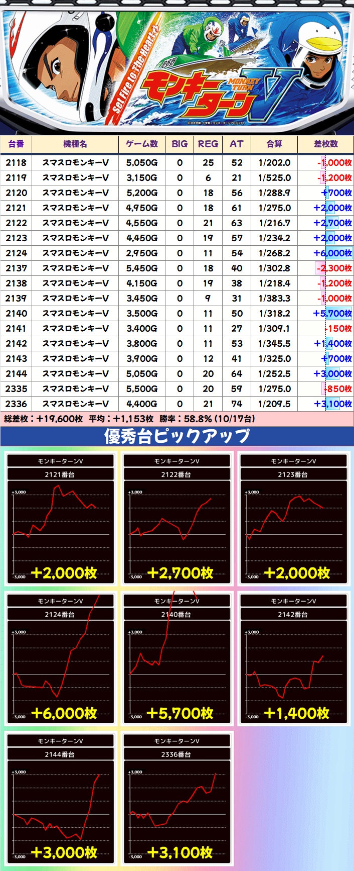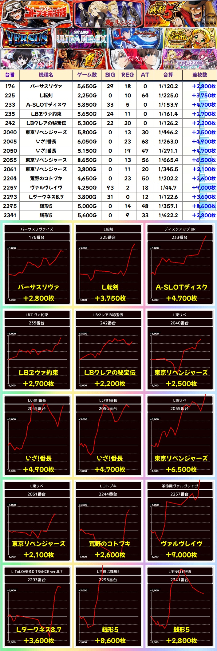 ほかにも様々なエリアで+2,000枚オーバーの優秀台が出現。東リべ・ヴヴヴ・銭形5には+5,000枚オーバーの爆裂台があったりと、随所で盛り上がりをみせました。