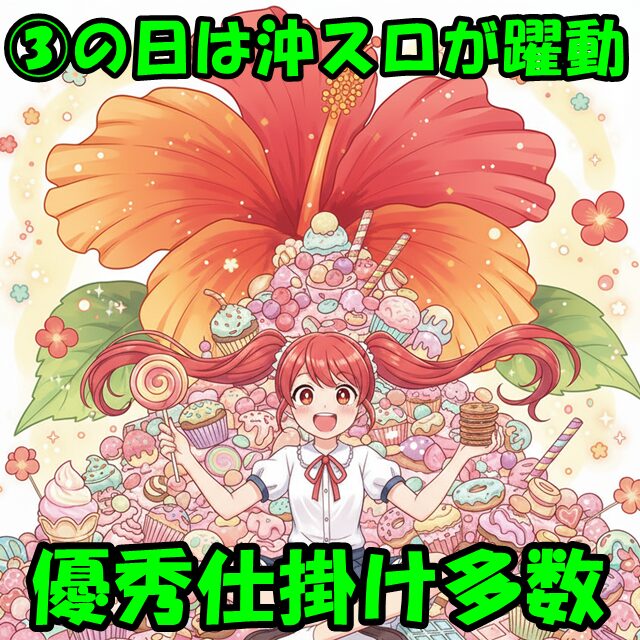 今回も沖スロコーナーからは全台系&1/2系濃厚の好調機種が複数出現。3のつく日の沖スロは特に強めになっているので、積極的に狙っていきましょう。