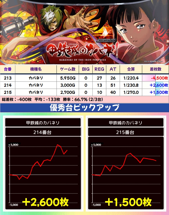 新台では新鬼武者3が1/2系濃厚で平均+1,000枚オーバーの好成績。ここからは万枚突破台が飛び出すなど、新しめの機種にも強めの仕掛けがありました。少台数機種ではカバネリ、ノーマルではディスクアップ2がニブイチ以上当たりと思われる結果に。
