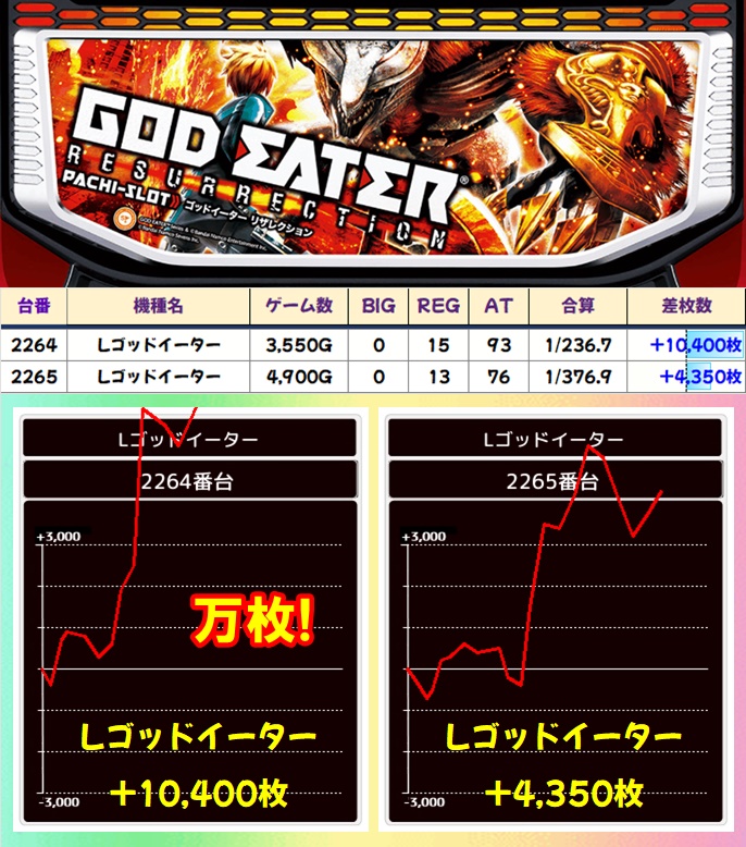 今回は主力機からマギレコが全台系濃厚に。安定した挙動の台が多く、5台が+3,000枚以上をお持ち帰り。平均差枚は+1,500枚としっかり出ていました。そのほかモンキーVが1/2系濃厚となっており、平均差枚+1,000枚オーバーとこちらも優秀。単品ではゴッドイーターに万枚突破台があったりとお宝満載でした。
