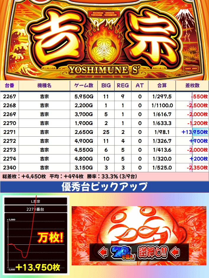 その他の人気機種では吉宗に万枚突破台を確認。こちらは勝率こそ高くはなかったものの稼働は良好だったことから、高配分になっていたのではないかと思われます。メイン機種だけでなくどの機種も仕掛け対象になり得るので、狙い台が取れなかったとしても諦めは厳禁です。