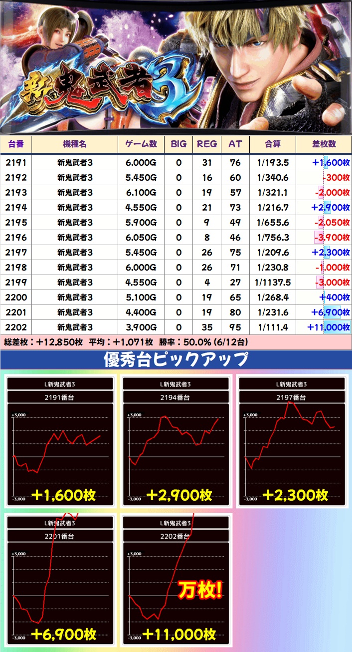 この日は全部で47台が+3,000枚以上をお持ち帰りし、万枚突破台も3台出現。メインから少台数機種まで満遍なく優秀台が確認でき、どこにでもチャンスがある状況に。新台では新鬼武者3が1/2系濃厚になっていたりと、新しめの機種にも注力されている様子が窺えました。
