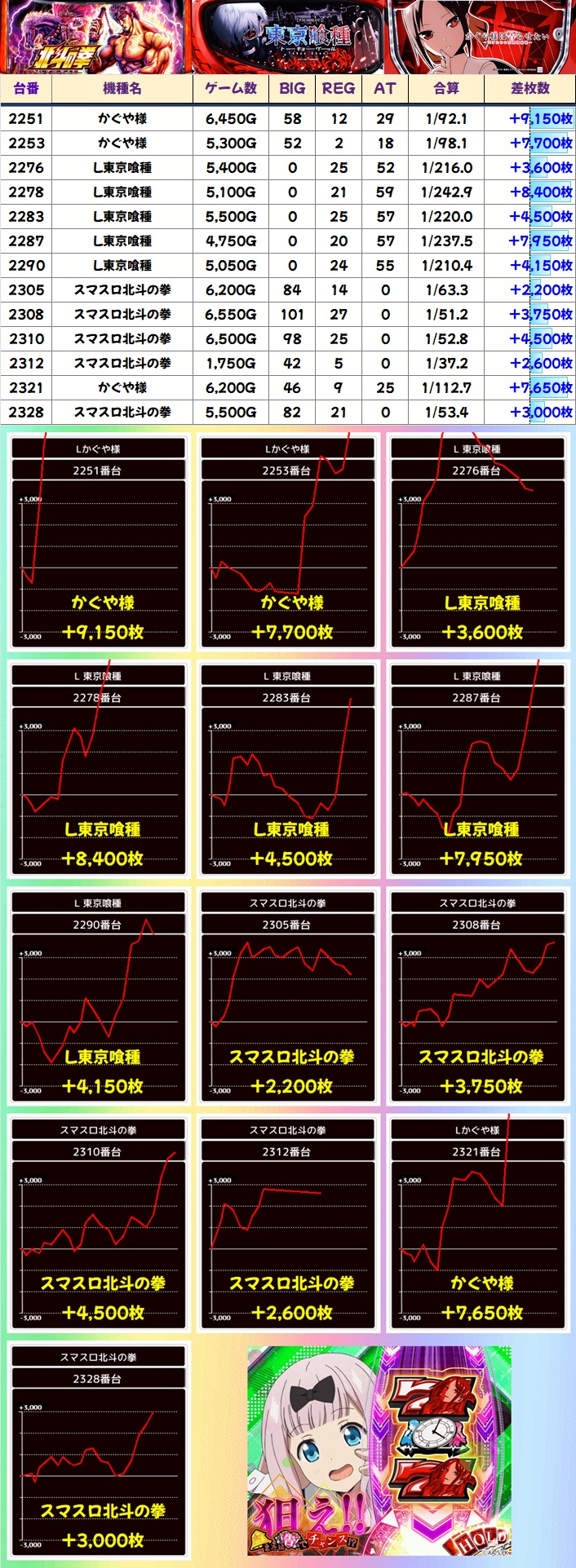 毎日オススメ機種も北斗・東京喰種・かぐや様に大量出玉の優秀台が散見され、今回も多くのお宝が散りばめられていた様子が窺えました。主力機・毎日オススメ機種は連日お宝投入に期待できるので、常に狙い目になりますよ。