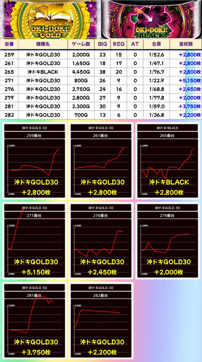 それ以外にもメインの沖ドキGOLDを筆頭に単品の優秀台が盛りだくさん。3のつく日の沖スロ強化はまだまだ続いていくと思われるので、今後の仕掛けにも乞うご期待!