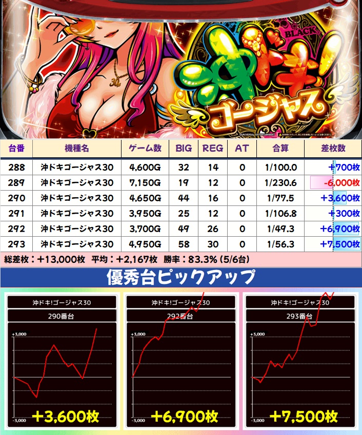 全台系濃厚のドラハナ閃光は全台プラスで平均+3,000枚と絶好調。稼働も抜群に良かったので、打ち手も手応えを感じていたことでしょう。1/2系濃厚だったのはキンハナ・沖ドキゴージャスの2機種。どちらも大量出玉の優秀台が散見され、平均差枚は大幅なプラスになっていました。